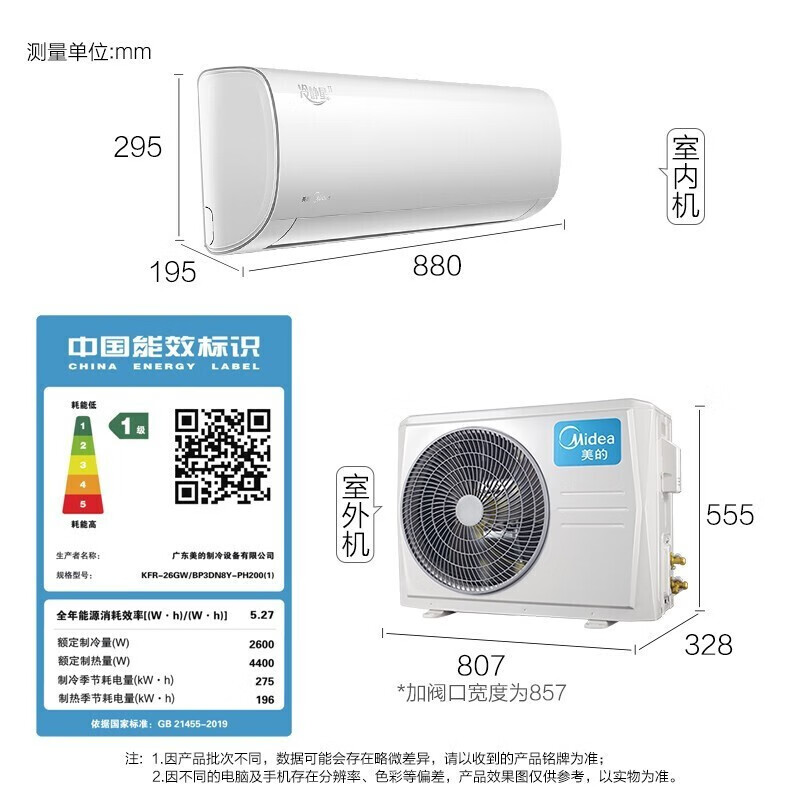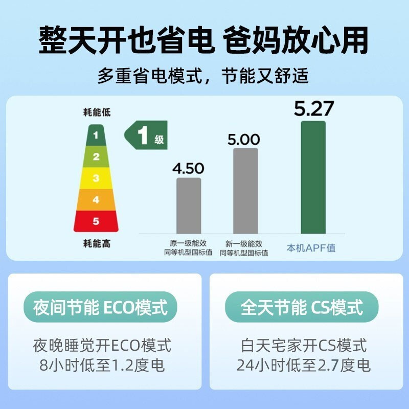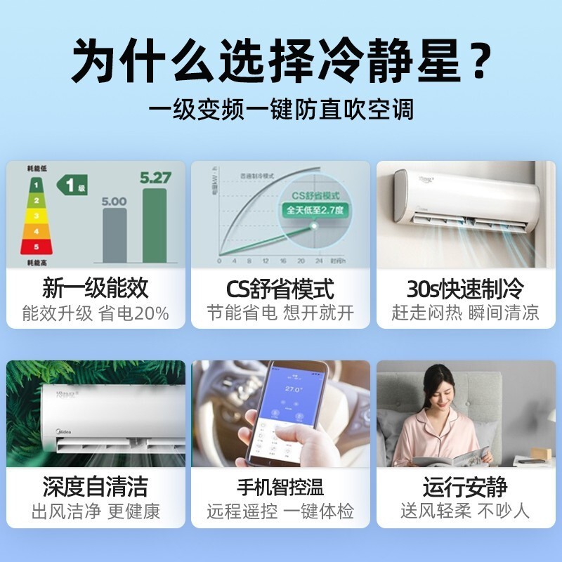 Midea 美的 冷静星Ⅱ采用R32新冷媒,整机采用了直流变频技术,能效比4.73,符合新国标一级。有效制冷面积11-17立方米、制热面积13-17立方米,制冷功率620W,制热功率1280W,循环风量580m3/h。具有光线识别检测功能,根据室内光线变化调节风速,送风可无级调速,散热片自动清洁,支持除湿功能,配备高密度滤网以及冷触媒滤网,让室内空气保持清洁,室外机叶片反向转动功能,能够将灰尘甩离叶片,室外机重量27KG。