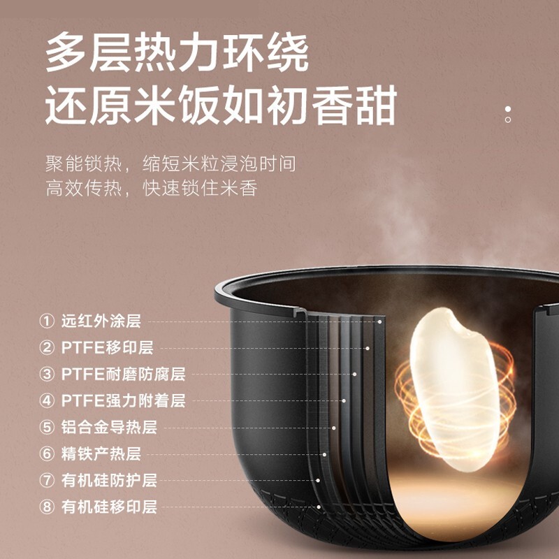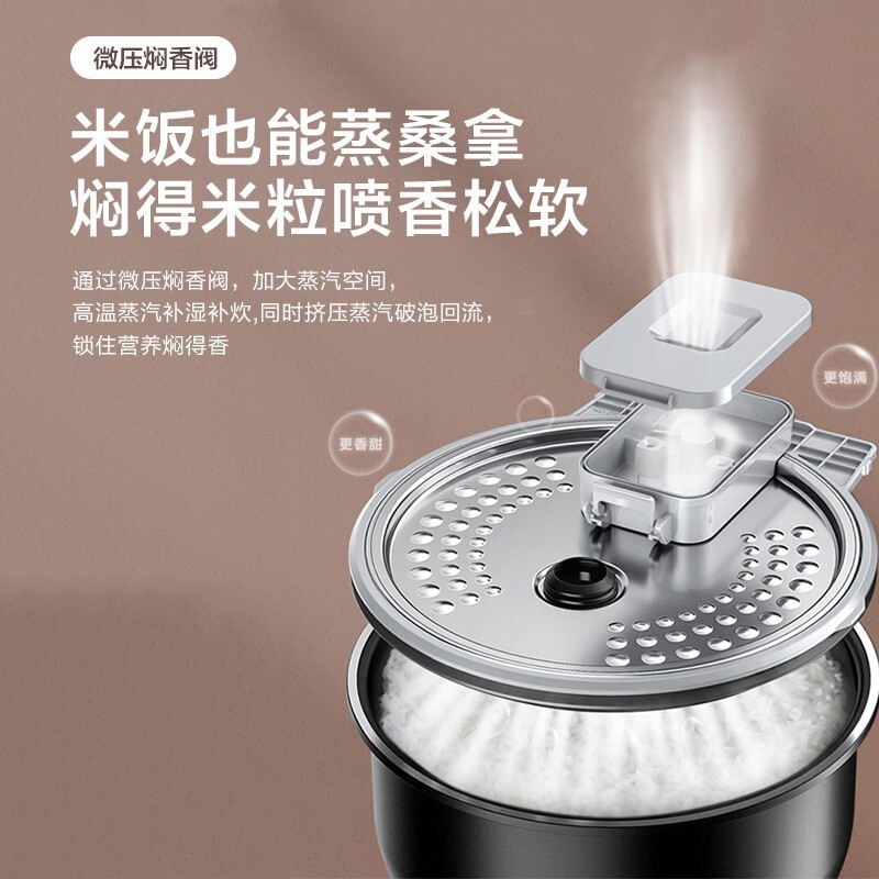美的 FB30M5-705T 电饭煲,采用立IH大火力加热方式,让每颗米粒饱满弹糯。通过微压焖香阀,加大蒸汽空间,高温蒸汽补湿补炊,同时挤压蒸汽破泡回流,锁住营养得香。8层精铁釜内胆,多层热力环绕,还原米饭如初香甜。支持24小时预约。