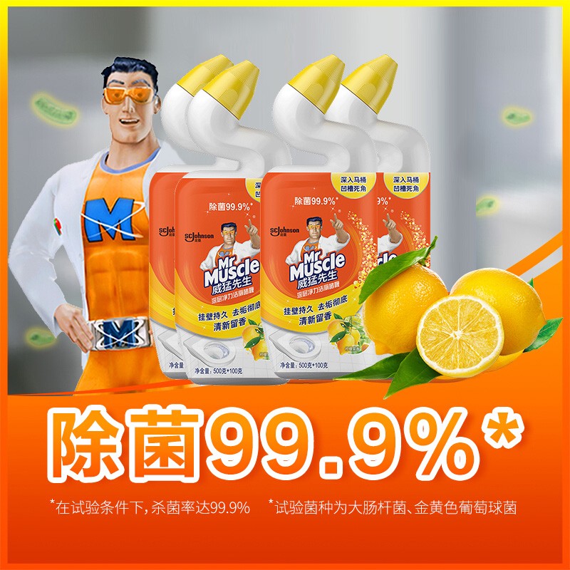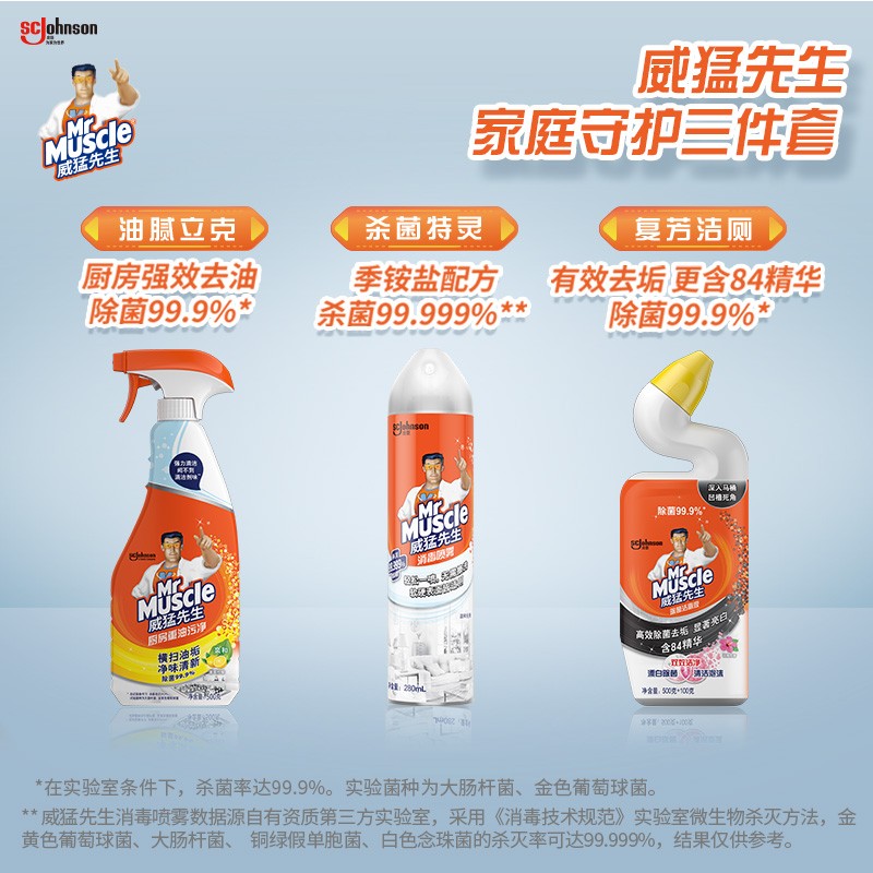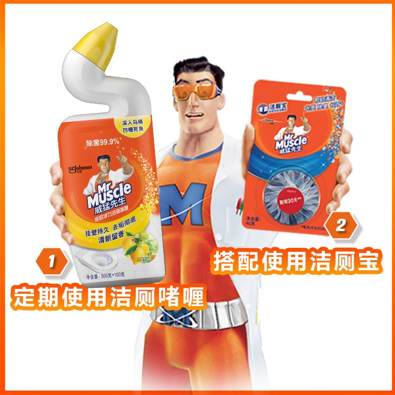 Mr.Muscle威猛先生和雷达、碧丽珠同属于美国庄臣旗下的品牌。这款清洁套装可有效清洁马桶内的污垢,使用后会留有淡淡的柠檬草的清香,带导向式喷嘴,使用更方便,使用时将液体均匀喷洒在马桶内部四周,使洁厕液沿马桶壁流下,再用刷子轻刷,用水冲净即可。