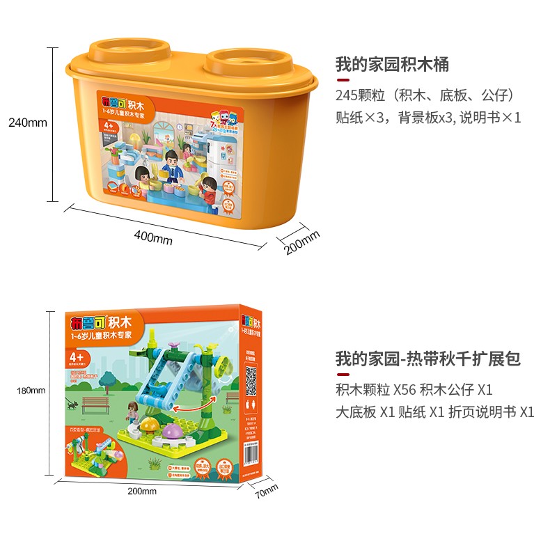 布鲁可创造大师积木桶系列80201我的家套组内含有245个大颗粒,可以拼搭出7个过家家场景和31种百变家居造型,玩法丰富百变。宝宝在搭建家具、自由布置房间到设计家园的过程中,逐渐培养空间认知能力以及生活常识、家庭认知。该套组主题包括厨房、餐厅、卧室、浴室、吉普小车、宠物窝和游乐园在内的7个,不同主题场景下家长可以与宝宝一起进行过家家的游戏,还能将房间变化为游乐儿童房、复式小楼房、杂货店、小飞机、超市和花店等不同设计。