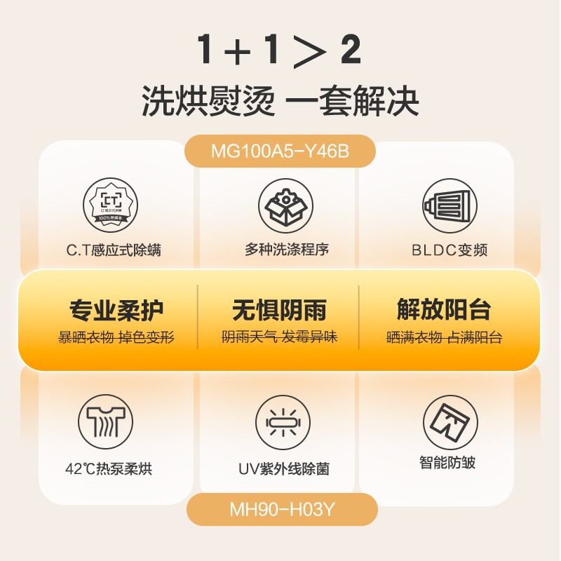 美的(Midea)这款型号为MG100A5-Y46B的滚筒洗衣机,具有10公斤大容量,采用BLDC变频电机,支持双重蒸汽抗菌除螨,多种洗涤程序,1.05洗净比,配备抗菌门封圈,内置云影雾灯,避免取衣遗漏,产品尺寸为595*530*850mm。