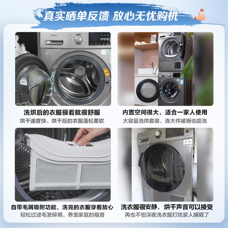 美的(Midea)这款型号为MH90-H03Y的干衣机,采用了节能高效的热泵式烘干,烘干容量9公斤,配备有多达9种烘干模式,满足多样使用需求。内置UV杀菌灯,搭配不锈钢内筒的镜面反射,可达到对内桶衣物99.9%的除菌。配备有双重毛线过滤网,以避免毛屑进入冷凝器,影响烘干能力。配备有温湿智能传感器,实现衣干即停,避免过度烘干,具备AI智能正反转,有效避免衣物缠绕。