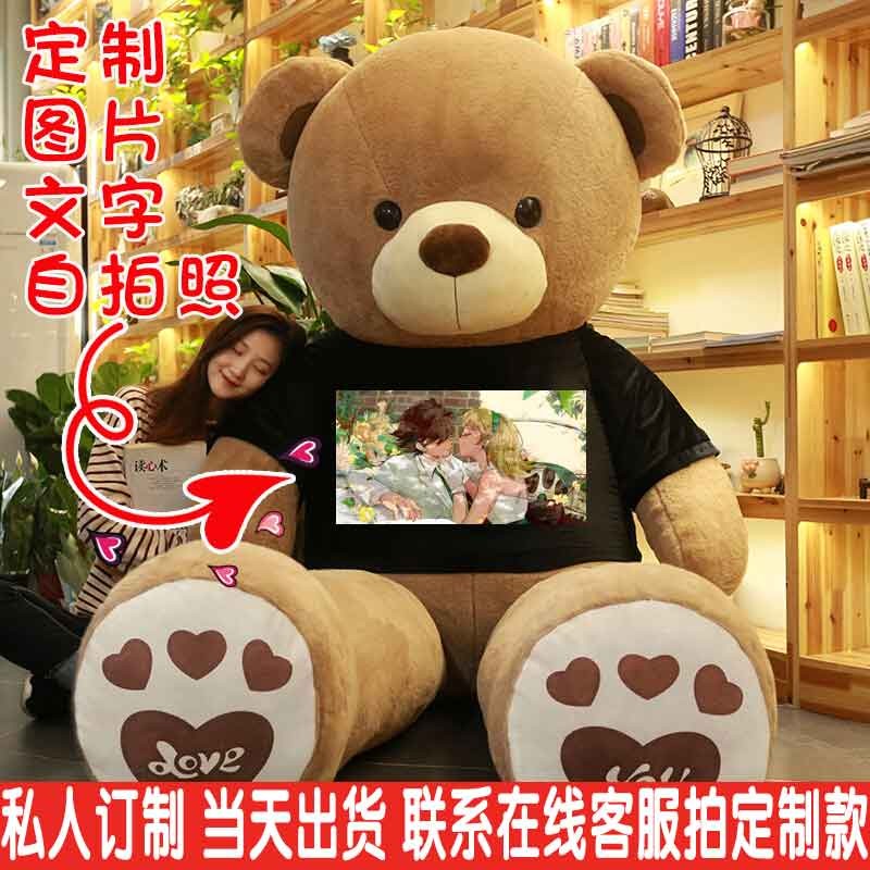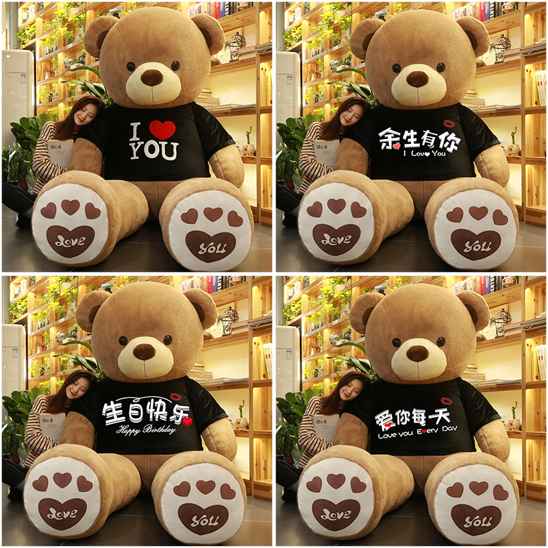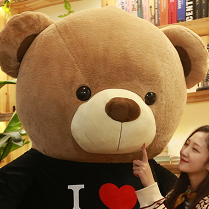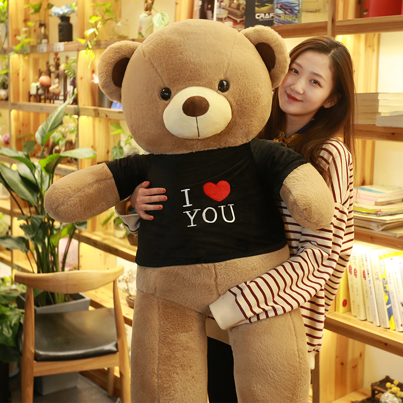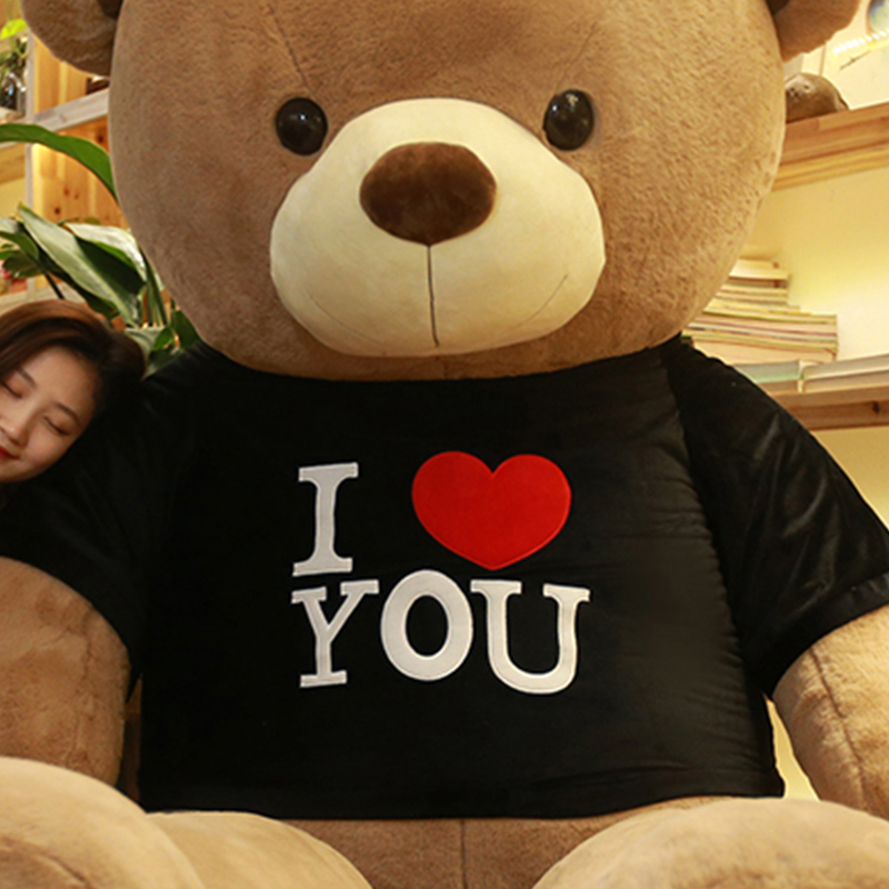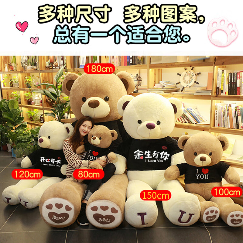 这款毛绒熊公仔高80cm,面料柔软,填充饱满,造型可爱,使用短毛绒面料,黑色T恤造型,适合送人摆放或作靠枕。