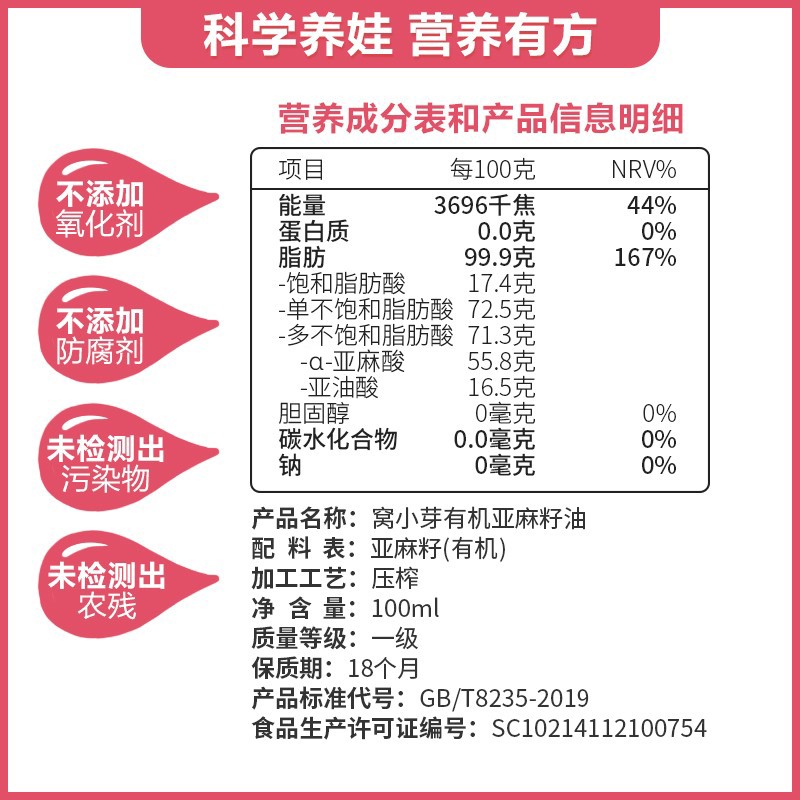 选用棕色玻璃瓶充氮包装,,有效隔离瓶口空气,降低油脂氧化速度,保留油中营养成分,选用六脱工艺,口感清淡无苦涩杂味。