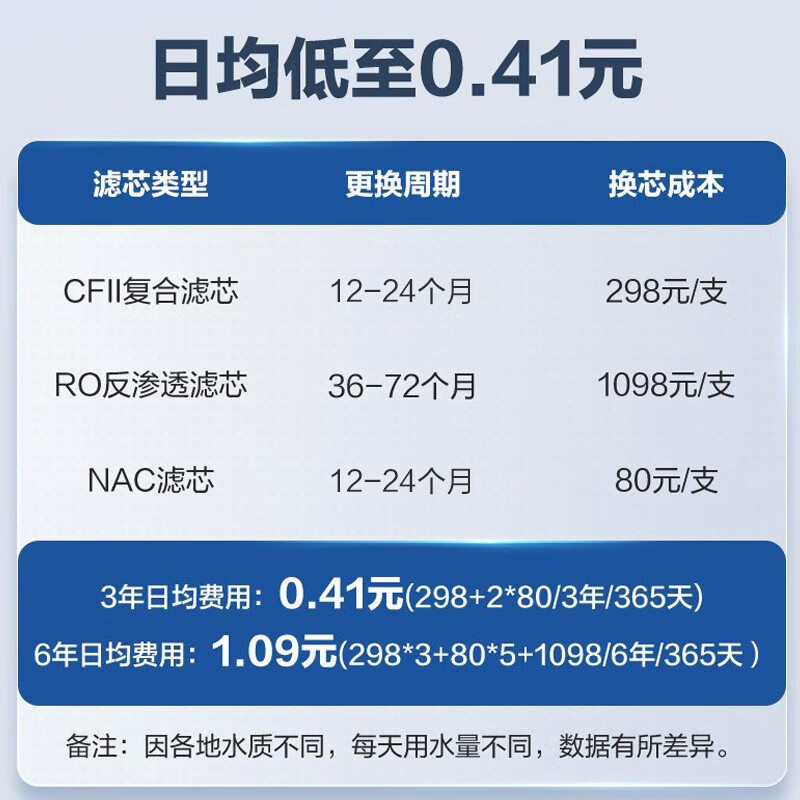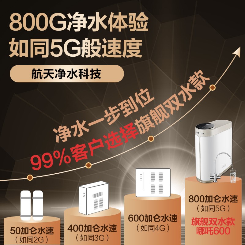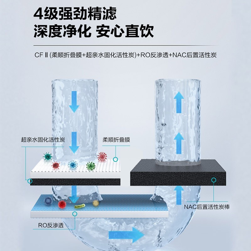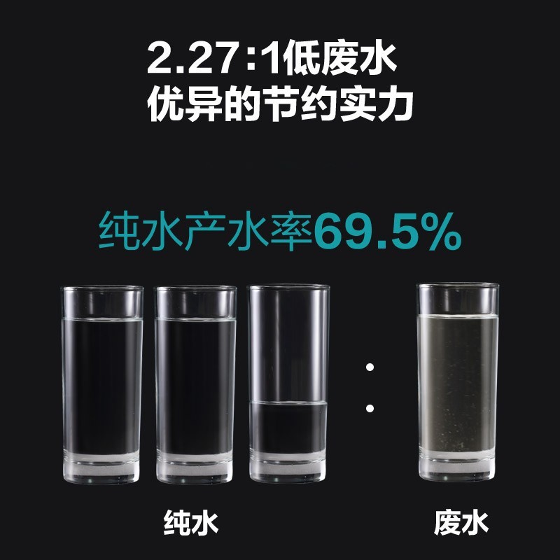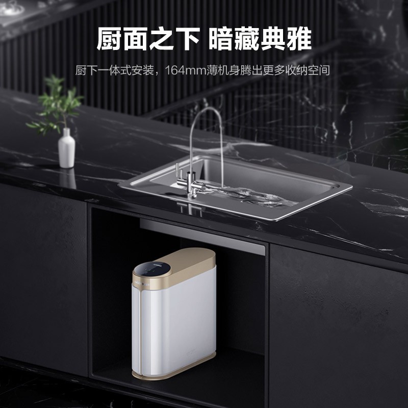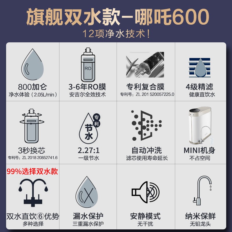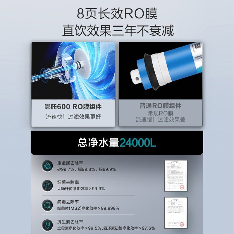 安吉尔 J2806-ROB90反渗透净水器,通量为800G,2.05L/min流量,搭载双出无铅水龙头,四级高精度滤芯,整机废水比2.27:1,额定净水量3000L,达到国家一级水效,支持自动滤芯冲洗,增加整体寿命,RO滤芯可使用3~6年。