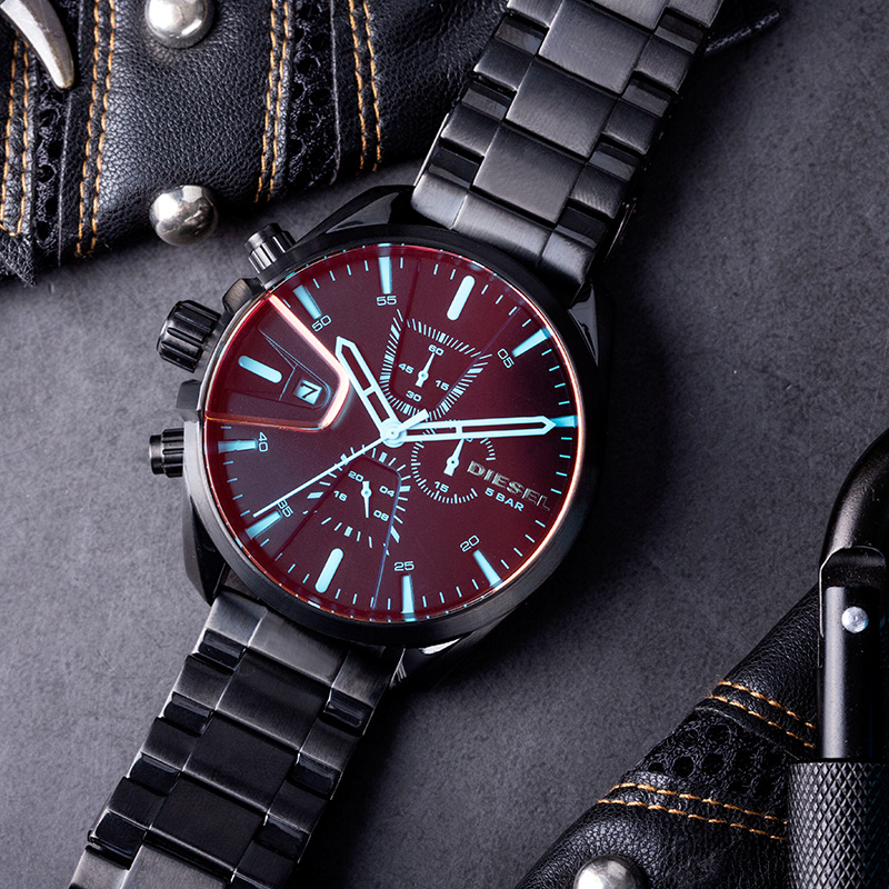 此款DIESEL 迪赛 MS9系列 DZ4489 男表采用矿物玻璃镜面,不锈钢表带,折叠扣,圆形表盘,9点位日历开窗,搭配石英机芯,防水50米,表盘厚度约12mm,表盘尺寸47*54mm,5ATM防水