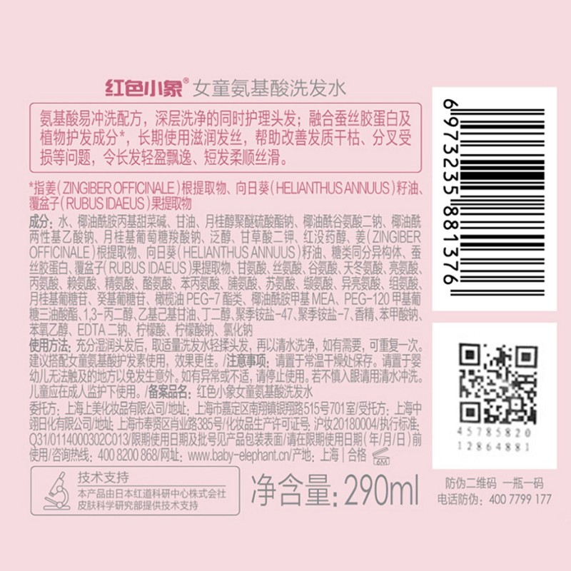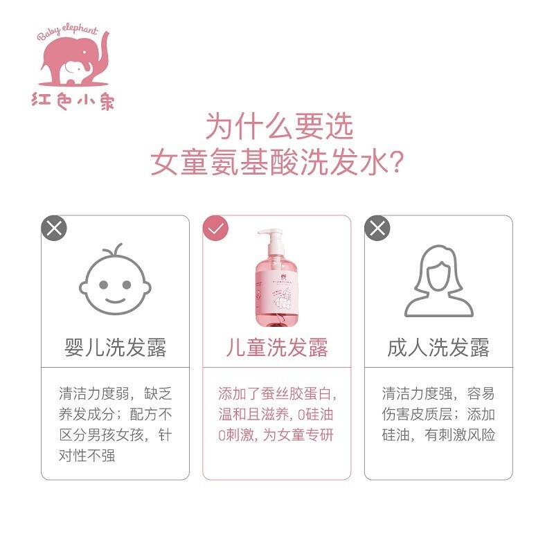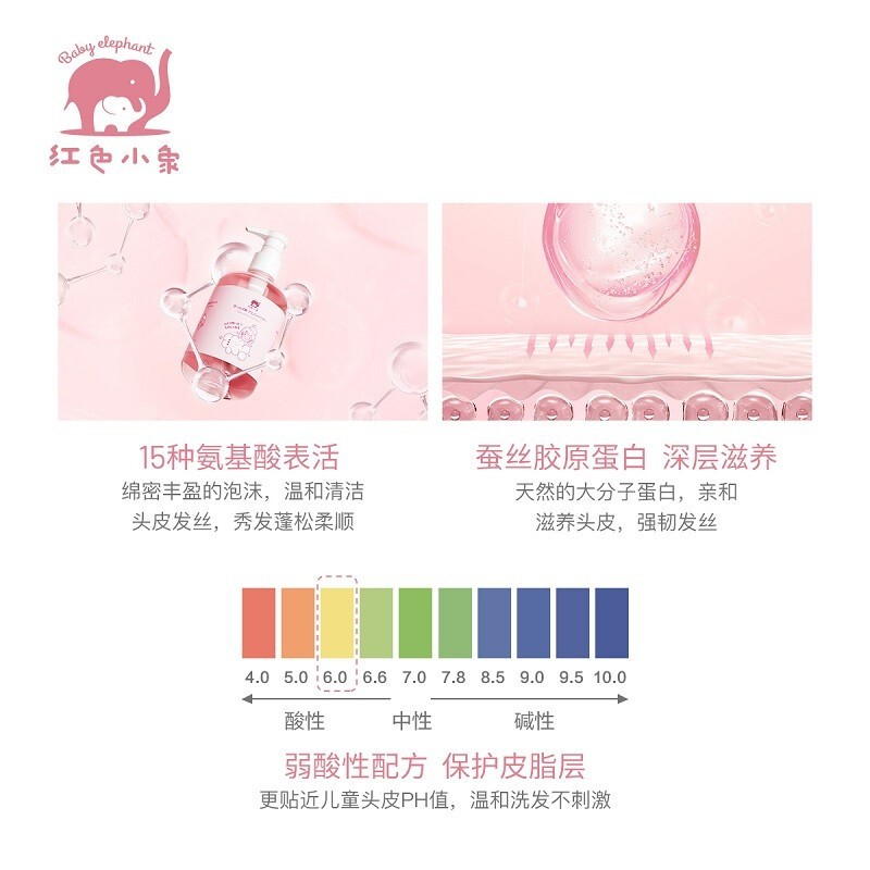红色小象是上海上美化妆品有限公司旗下儿童护肤品品牌,2015年成立。涵盖孕妇/婴儿/儿童系列产品的高端母婴个人护肤品牌,红色小象护肤品专为孩子设计采用高品质原料,经过严格的测试,确保每一瓶产品纯正温和,减少刺激。红色小象品牌理念“用科学孕育爱“。这款女童洗发水,专为3岁以上女童研发,泡沫绵密丰盈,温和洁净发丝。
