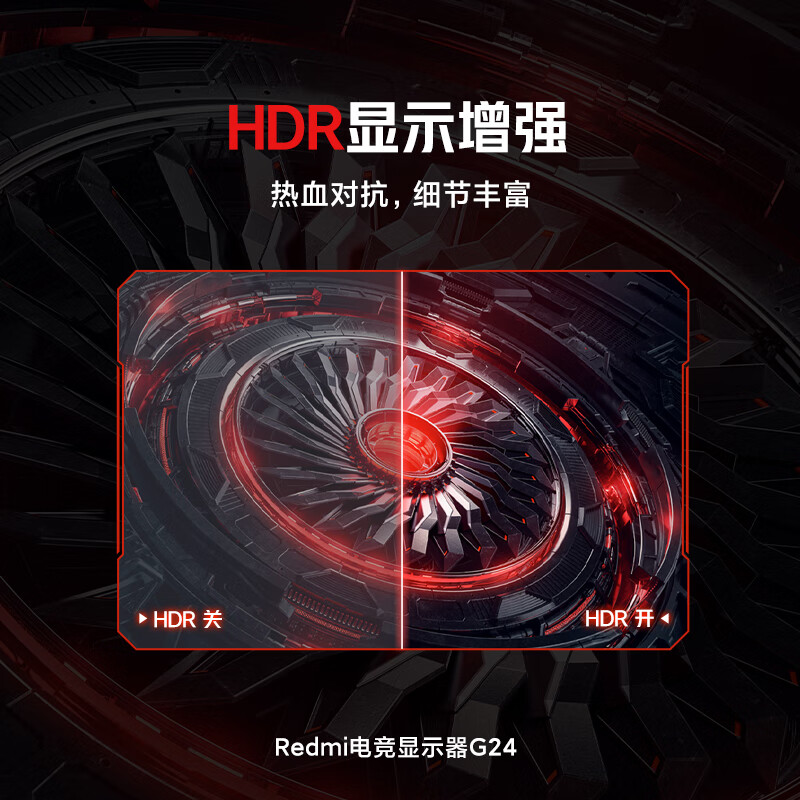 红米此款显示器采用VA面板,1080P分辨率,3500:1高静态对比度,165Hz刷新率,MPRT 1ms响应时间,支持G-Sync和Free-Sync功能。本机芯片支持HDR高动态显示,通过调节屏幕亮度,画面饱和度更高,使游戏图像更加逼真。