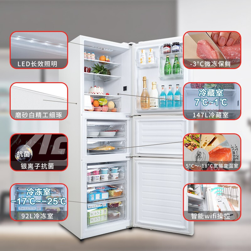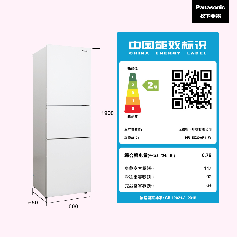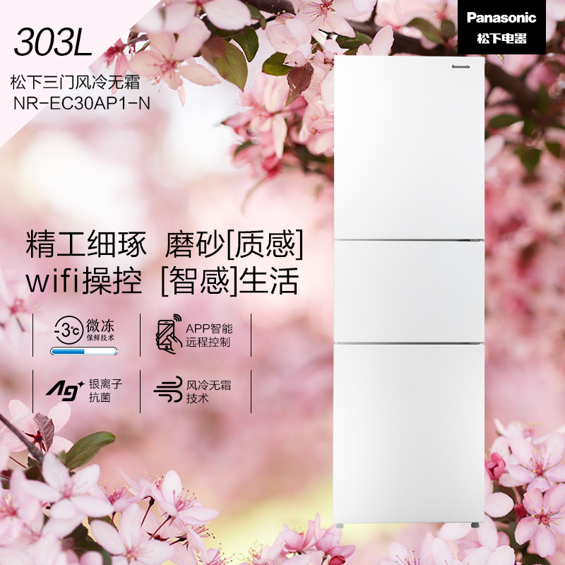 这款型号为NR-EC30AP1-W的三门冰箱,是松下(Panasonic)与20年最新上市的新品,带有APP智控/Ag银离子抗菌/除异味净化/-18-5℃宽幅自由变温室/-3℃微冻保鲜/冷藏室独立断电/智能控温/风冷无霜等功能,搭载松下原装变频压缩机,303升总容量(冷藏室147L/变温室64L/冷冻室92L),能效等级2级,综合耗电量0.76Kwh/24h,噪音39dB(A),纯平磨砂面板,箱体尺寸(长*深*高)为600*650*1900mm。