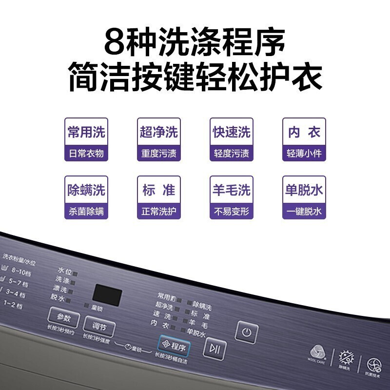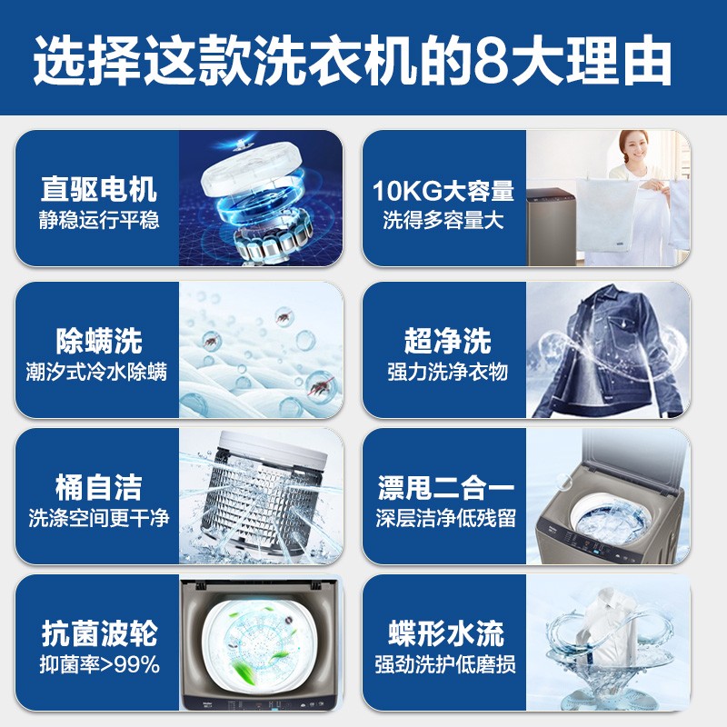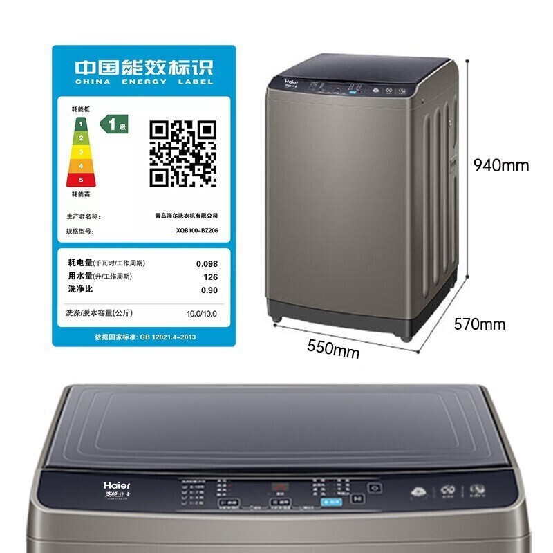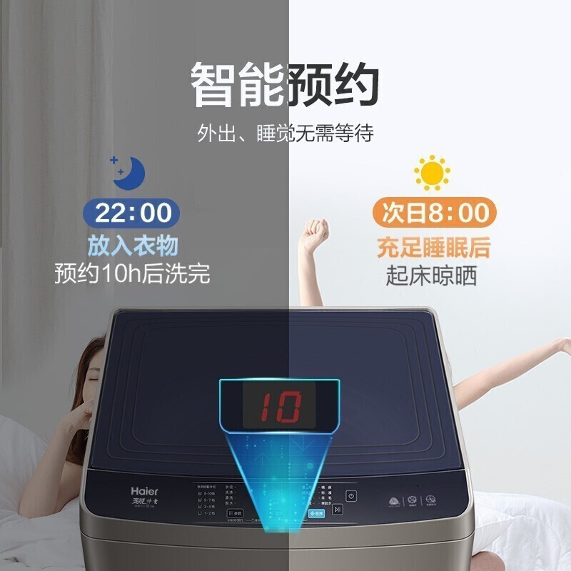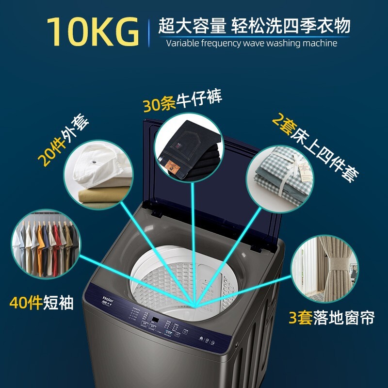 海尔10公斤波轮洗衣机XQB100-BZ206,拥有童锁,大容量, 智能预约, 水电分离等多种优点 1.海量空间:升级10kg海容量洗涤,现代大家庭必备,满足全家洗涤需求,让家务变得更轻松。 2.动力十足,大件轻松洗脱:好电机就像好心脏,变频电机为洗衣提供强劲精准的动力输出,大件家纺、厚重衣物也能轻松洗净、甩干。 3.新匀洗波轮,洗衣更护衣:波轮转动产生蝶形水流,承托翻转衣物,减少与波轮的摩擦,轻柔洗护。 4.智能预约,合理避开水电高峰:1-24h智能预约洗,自由设定洗衣完成时间,错开用水用电高峰期,抽打细算为你而省。 5.一键操作洗衣,不再难倒父母:为年长父母专属设计,删繁就简,开机后只需按下启动键,即可开始洗衣。