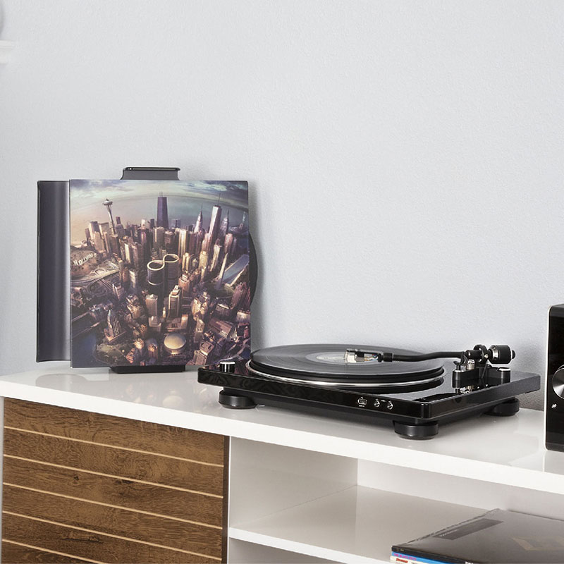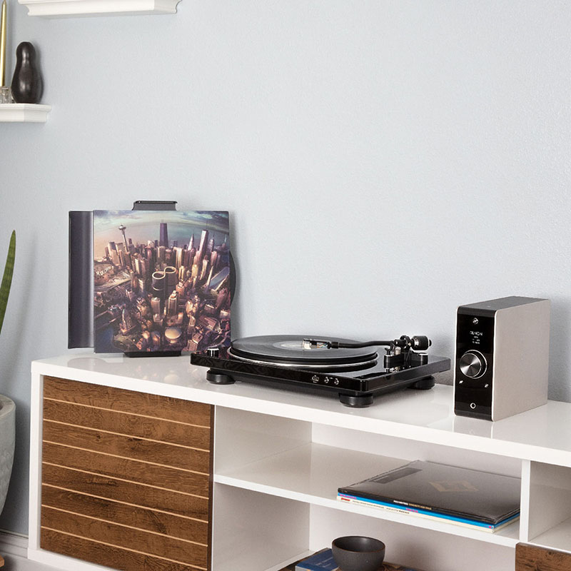DP-450USB 是天龙于2018年末发布的黑胶唱机,采用弯曲形水平拾音臂设计,可以在播放结束时自动抬起,避免过度磨损唱针,可分离式防尘罩,也可当作唱片架使用。。自带一枚MM唱针,兼容MM唱针与MC唱头,配备多速选择器,支持33 1/3 rpm、45 rpm 以及 78 rpm。唱机内置均衡电路,可与各种功率放大器匹配,支持将唱片翻录为WAV与MP3格式,随时随地畅享音乐。