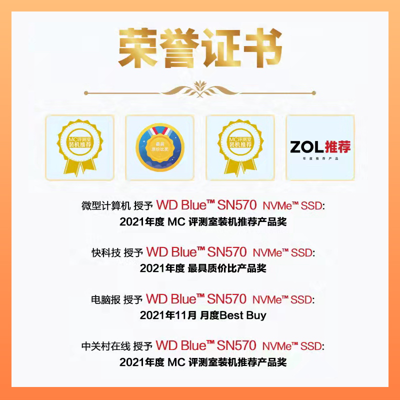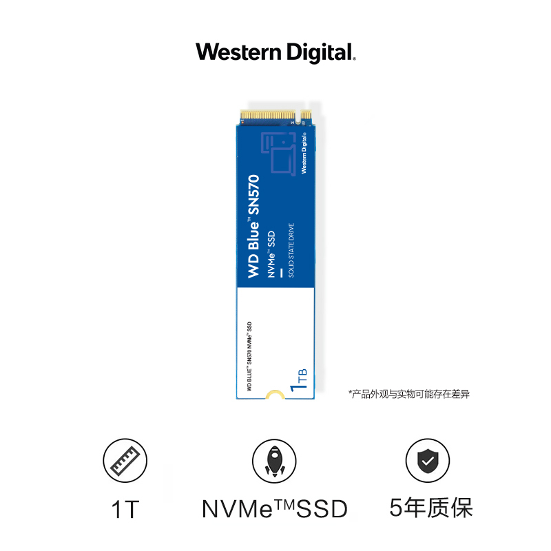 Blue SN570 固态硬盘使用超薄的M.22280外形规格,更节省空间,读取速度3500MB/s,写入速度3000MB/s,提供5年保修。提供250GBー1TB不同规格容量,可按需选择。