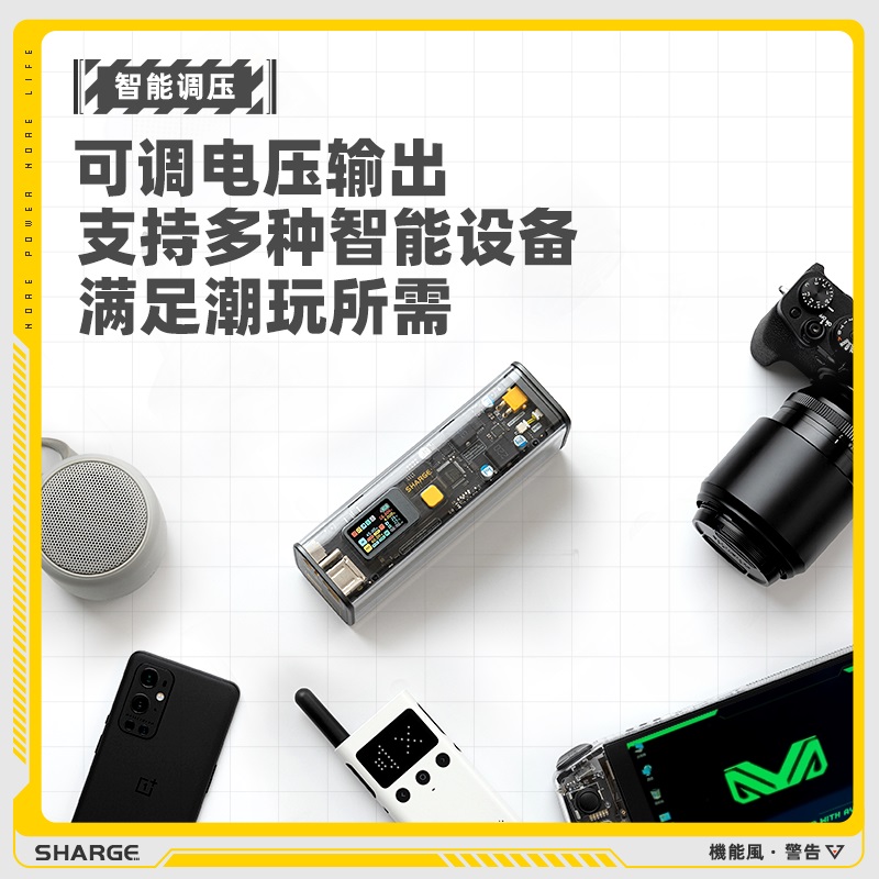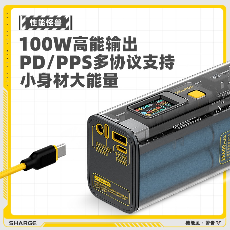 此款充电宝最大特色是采用全透明的外壳,内部精密元器件可见。全铝合金骨架,沉金主板工艺,展现工业美学;采用IPS全彩硬屏,参数可调,直观查看输出输入功率。可乐罐造型,方便握持。全铝散热骨架结构,更便于背包或者行李箱携带。