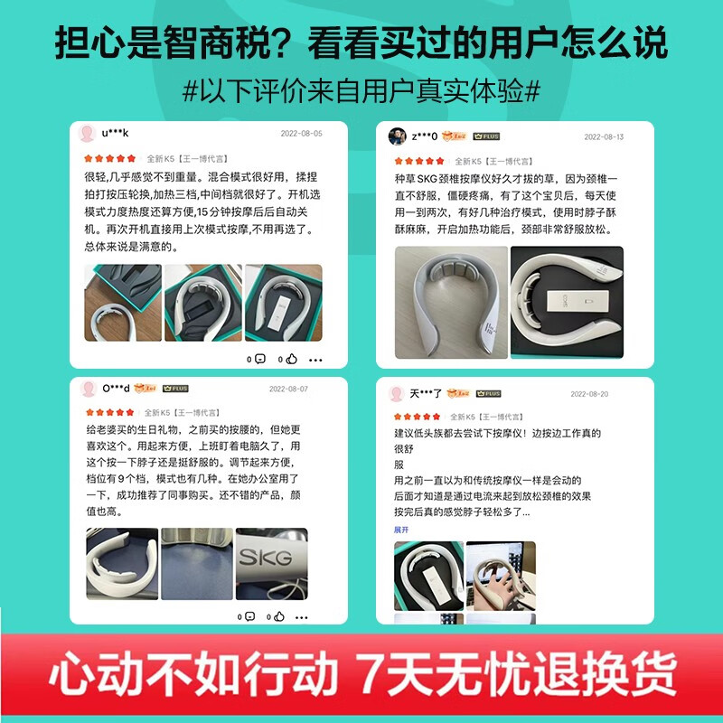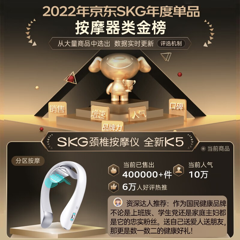 SKG K5-2 颈部按摩仪,创新银离子电极+亲肤水凝贴,真正实现深层按摩无刺感;4大全新3D灵动按摩模式(四指联弹按摩法),TENS+EMS双脉冲;面状加热,大面积加热,舒缓疲劳更高效;APP+小程序双智控,华为云技术,便捷更智能,远程按摩程序下载,更好匹配适合你的按摩方式;技术引领,70项行业专利。
