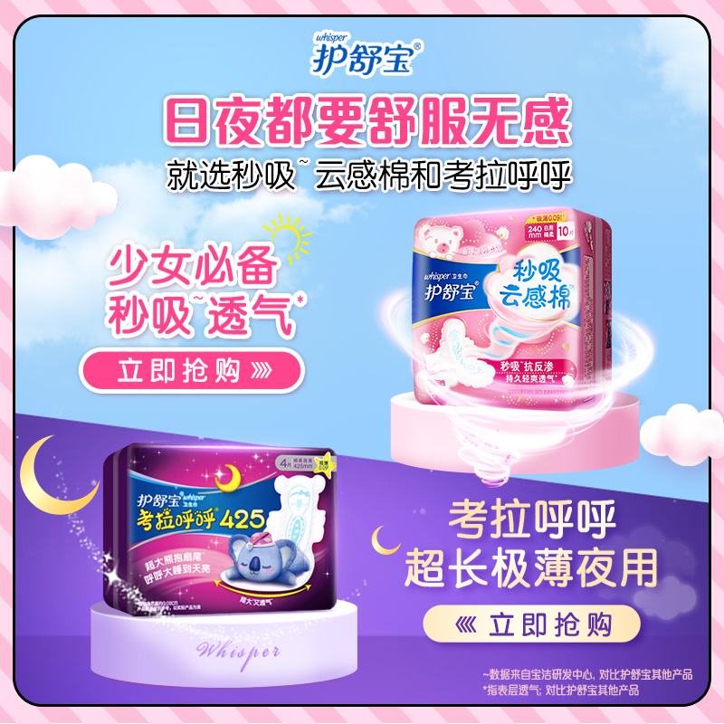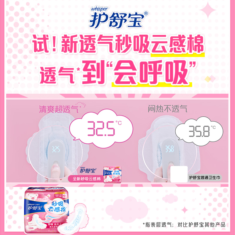 护舒宝(whisper),美国宝洁公司的一个女性保健用品品牌。自1991年进入中国以来,护舒宝一直致力为中国女性提供优质的日用护理产品。此款云感棉超薄透气日用装,柔软舒适,双向呼吸孔,透气舒爽,不会感到闷热~