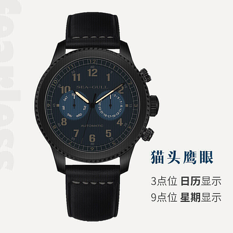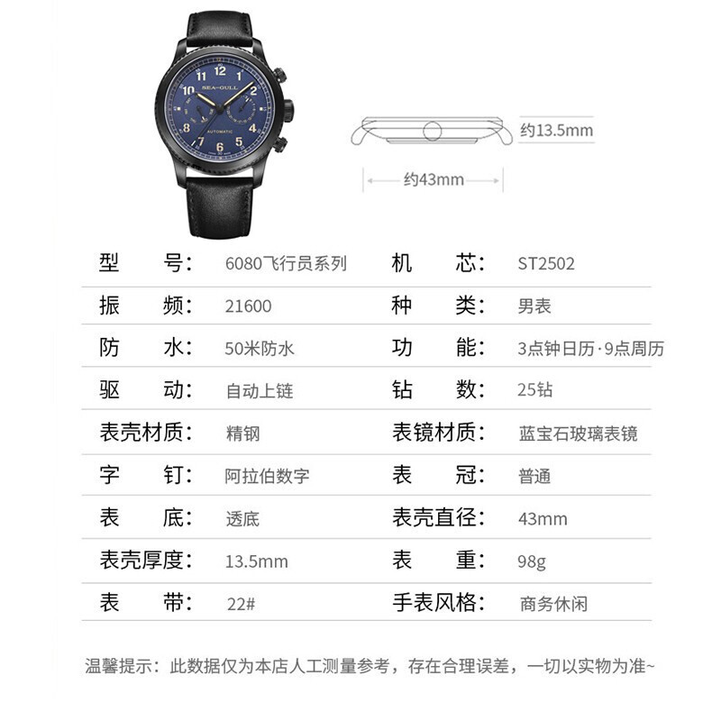天津海鸥手表集团公司是以天津手表厂为主体,由十六家手表专业生产企业及四家合资企业组成的企业集团。6081 819.33.6080H 男士自动机械腕表,采用ST2502机芯,零件构成复杂,经久耐用,性能稳定,双日期设计,螺纹表冠,简洁耐看,背透设计酷炫有型,夜光功能,清晰数字时钟显示,直径43mm,厚约13mm。
