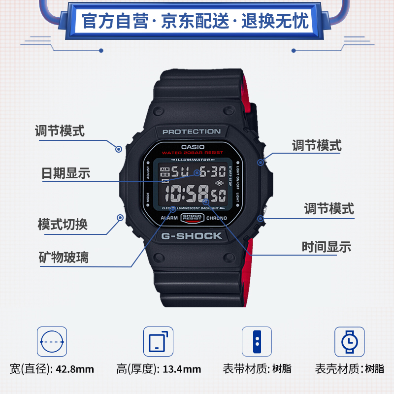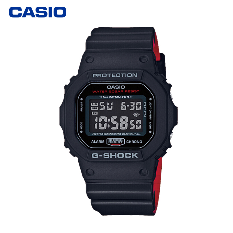 CASIO 卡西欧 G-SHOCK 的5600系列虽然没有光动能或者电波对时,却被国内外玩家推崇,奉为经典之作。这款G-SHOCK系列DW-5600E-1V 男表采用石英机芯,矿物强化玻璃表镜,清晰耐刮,经典方块表盘,阿拉伯时标数显,同时拥有电子荧光照明,防震,多功能闹铃,全自动日历,倒计时等功能,简单大方的设计,抗震耐摔的特质,突破传统的防震结构,有效缓冲外力的冲击,树脂表带佩戴舒适,表盘直径38mm 厚度11mm,200米防水