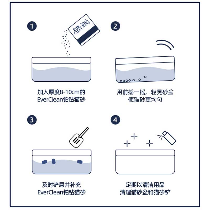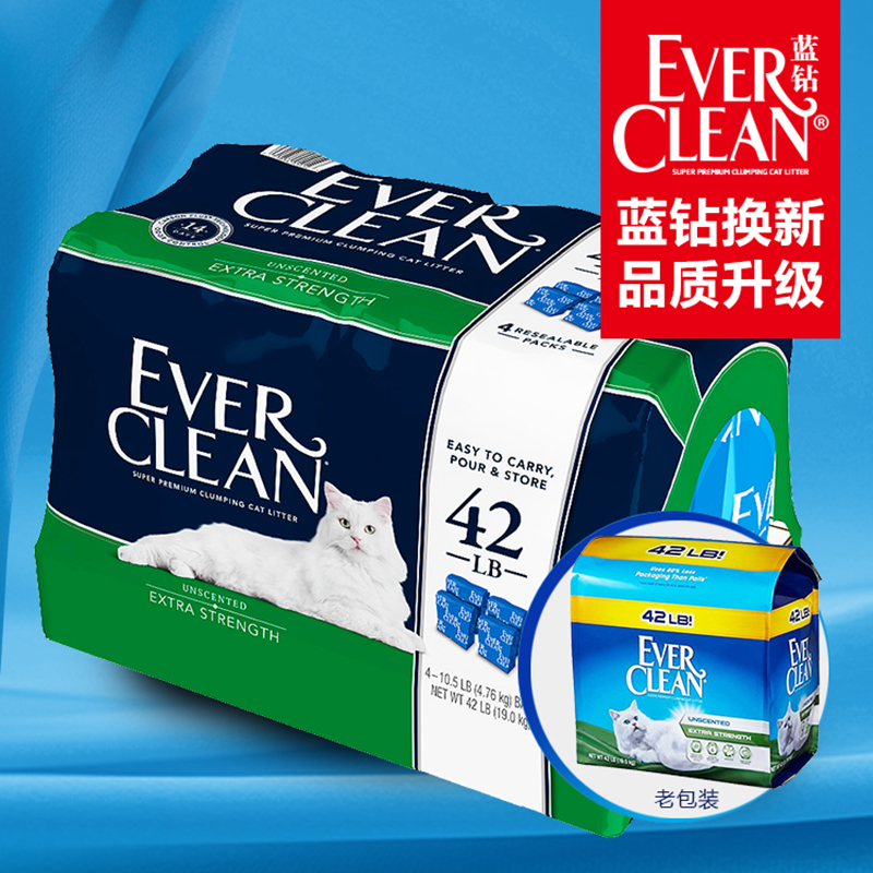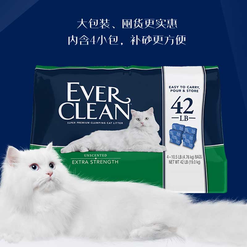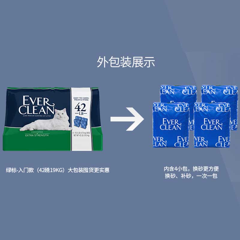 Ever Clean 铂钻 绿标 猫砂,深蓝色简约风,非常有质感,全英文纸盒设计,清晰展示是我们熟悉的美国“EVERCLEAN”,包装结实不易破损。主打“持久抗臭”型猫砂,细颗粒砂,五香味滴过敏,适合对气味敏感的猫咪和人群。独家专利技术将活性炭包裹在每一粒砂上,超强净味。超优质结块猫砂,高效凝结力,含抑菌成分