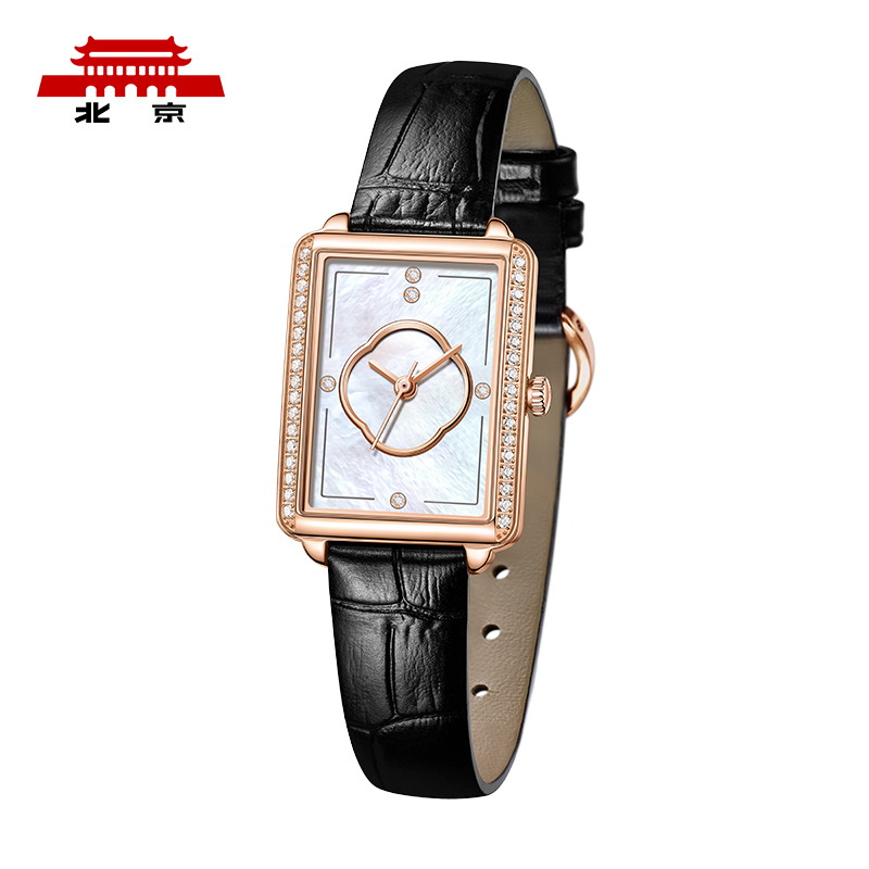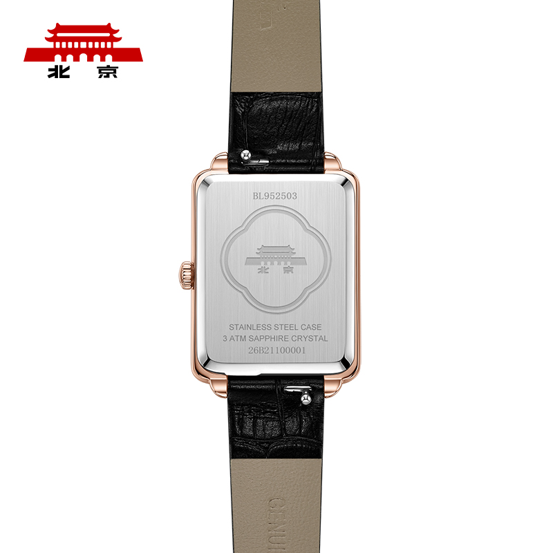 北京 东方文化系列 女士石英表 BL952503,庭院常见美人来,东方美人的气韵,常见于园林咫尺园廷,收纳如花美眷,良辰好景,框景入腕,时间流转方寸之间,窗棂表壳提取自古典园林艺术,表壳造型灵感源自园林窗棂轮廓,线条简洁利落,壳型别致小巧,流畅贴腕,浑然一体,表壳侧面倾注巧思,采用弧形设计与表耳连贯衔合,尽显美人纤细风姿,双边镶嵌璀璨锆石,举手投足间闪动盈盈光彩,纤细牛皮表带,轻柔环绕腕部,皮面压制竹节纹,富有质感,表径:27*21mm,30米生活防水。