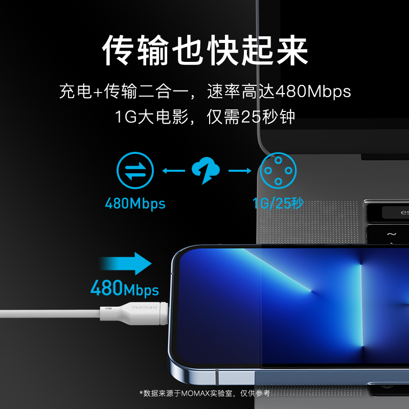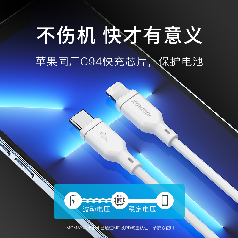 线身采用苹果同档TPE线,触感亲肤高回弹柔软耐拉扯,不易缠绕打结;接口处采用一体注塑加固,通过 15000+ 摇摆测试不断不裂,更耐用。接头采用原装 C94 快充端子头,充电传输稳定不弹窗。阶梯式接口设计,带壳插拔也流畅。传输速率 480Mbps,充电/数据传输同步进行。通过 MFi 认证,支持 PD 快充协议。