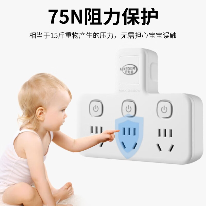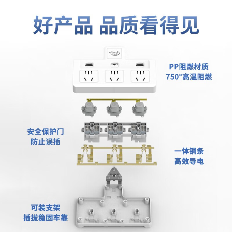全氟己酮灭火颗粒,750℃高温阻燃,PP阻燃材料,符合国家灼热丝检测标准,离火即灭。独立开关,一对一控制,每个插口可独立控制通断电。保护门升级,75N阻力保护,相当于15斤重物产生的压力,无需担心宝宝误触。线芯加粗33%,横截面增大,电流更稳定,输电损耗更少,导电更安全。