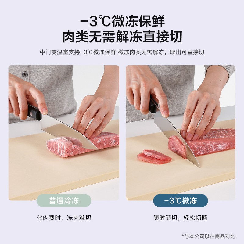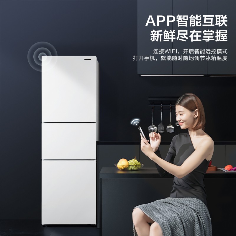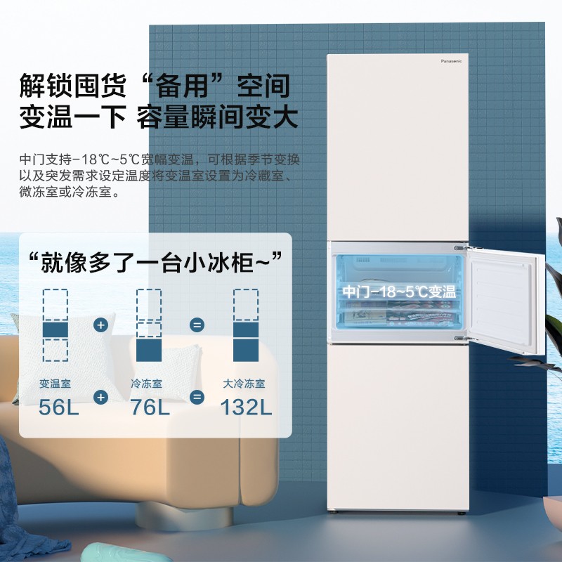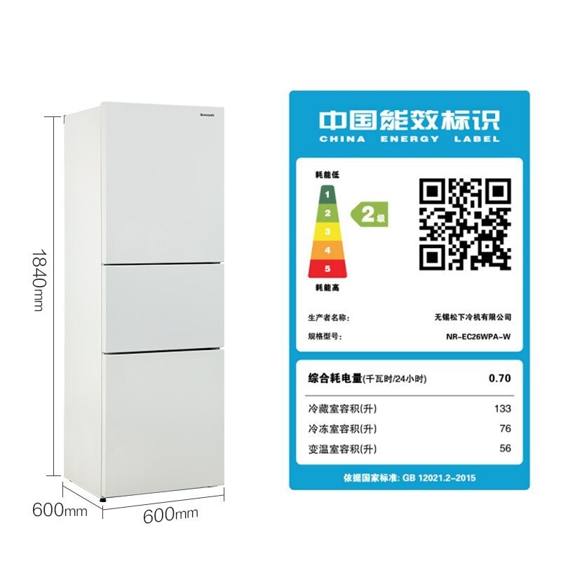 松下(Panasonic)这款型号为NR-EC26WPA-W的三门冰箱总容积为265L,其中冷藏室133L、冷冻室76L、变温室56L;主打超薄设计,机身厚度和宽度均为600mm(机身高度为1840mm);中门支持-18℃-5℃宽幅变温,支持-3℃微冻保鲜,配备银离子抗菌装置;搭载松下自产的变频压缩机,综合耗电量0.7度/天,冷冻能力4.0kg/12h。