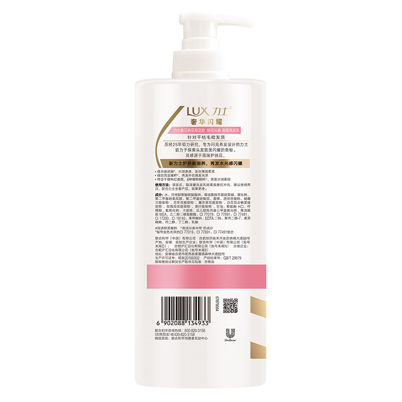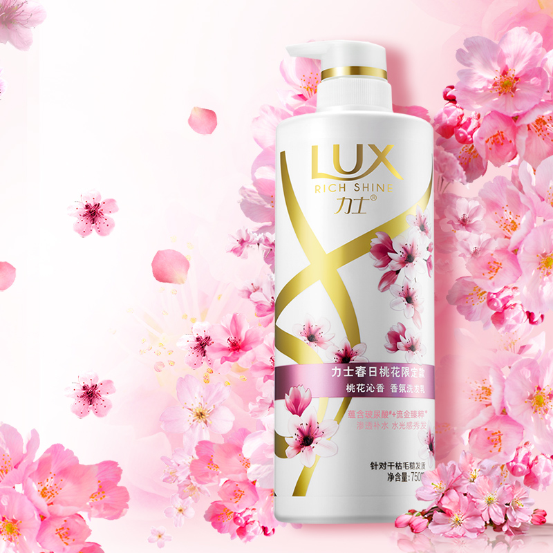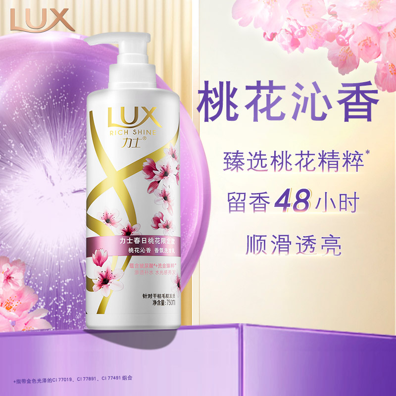 LUX力士是联合利华旗下个护品牌,其产品包括洗发乳,润发素,沐浴露和香皂等。这款桃花沁香洗发水添加了富含护肤级玻尿酸成分,融汇流金臻萃,使发丝顺润有光泽,水润保湿,香味宜人,留香时间久,前调为柑橘、薰衣草,中调为千瓣红桃花、玫瑰,后调为香草、檀香,层次丰富,甜美但不媚俗。