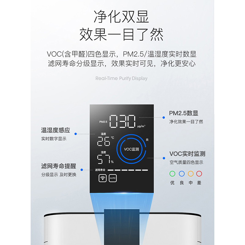 双面进风,错步式涡轮结构,搭配直流无刷电机,突破性 空气立体循环技术,稳定输出,效率更高。全效过滤净化甲醛、PM2.5、病毒、细菌、花粉、,二手烟等污染物,拒绝室内空气危害。特制催化改性活性炭,丰富而规整的孔道结构快速,捕捉分解甲醛、甲苯、TVOC等有害气体。