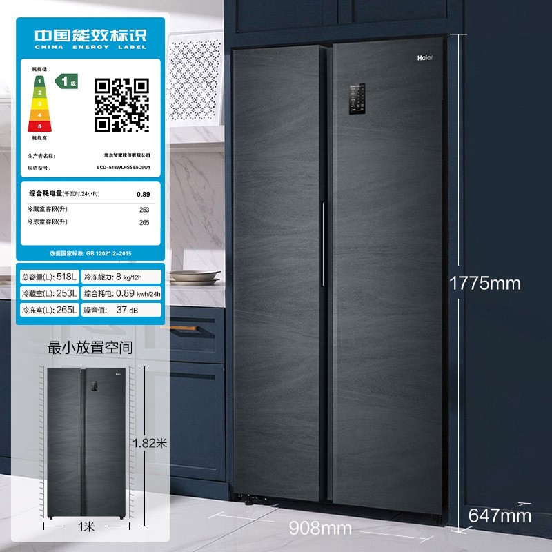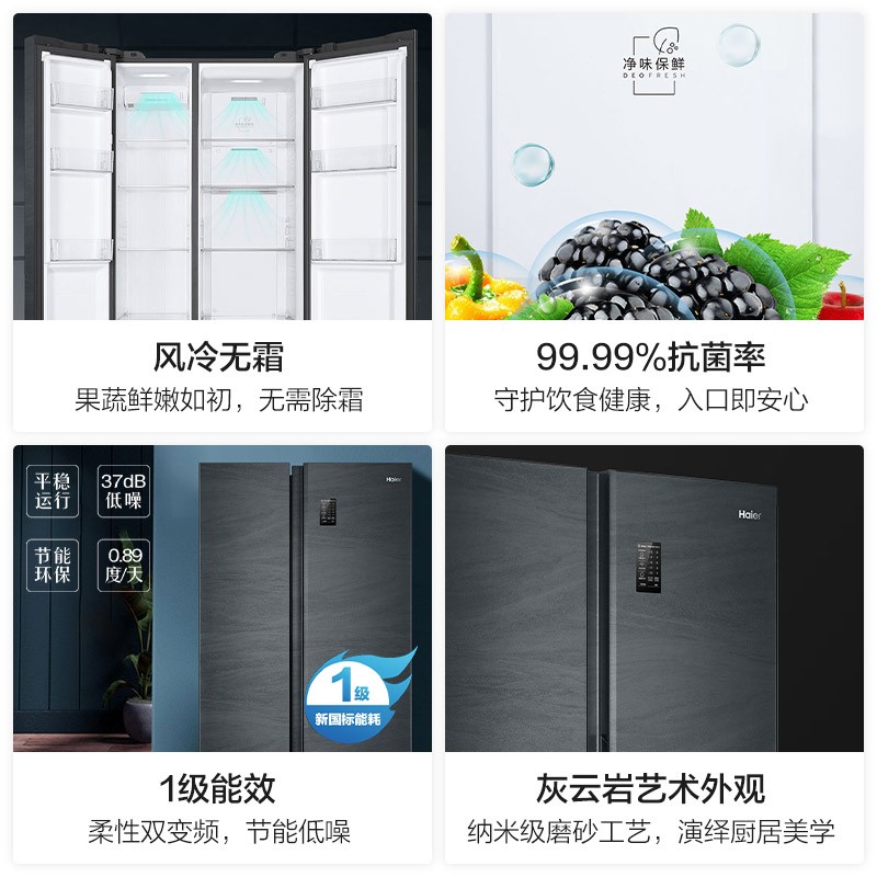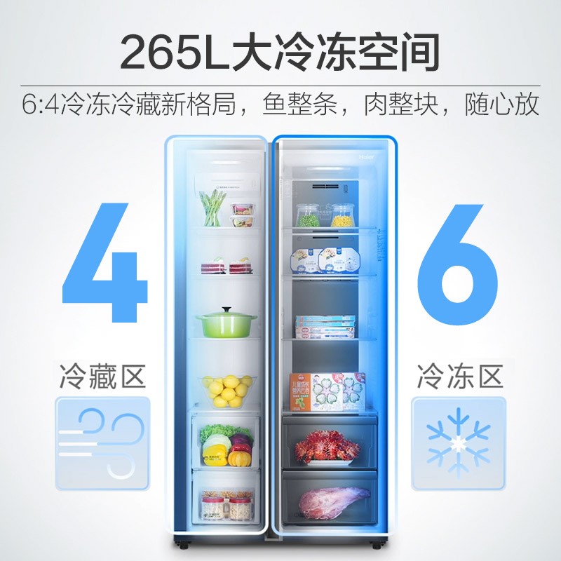 518L美食大空间,精藏两周食材,265L冷冻容量大突破,重塑"大冷冻"格局。植萃净味杀菌,提取桉叶油或柠檬有效成分,祛除有害细菌,品质双变频,实时调节制冷,新鲜更持久,节能低耗,每天不到一度电,静静享受鲜生活。