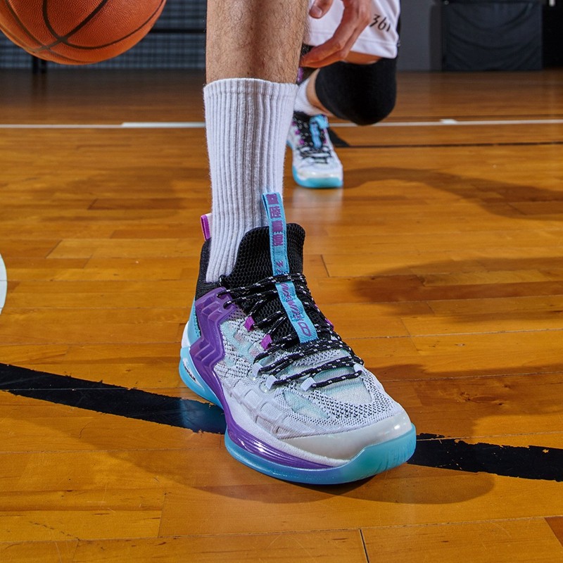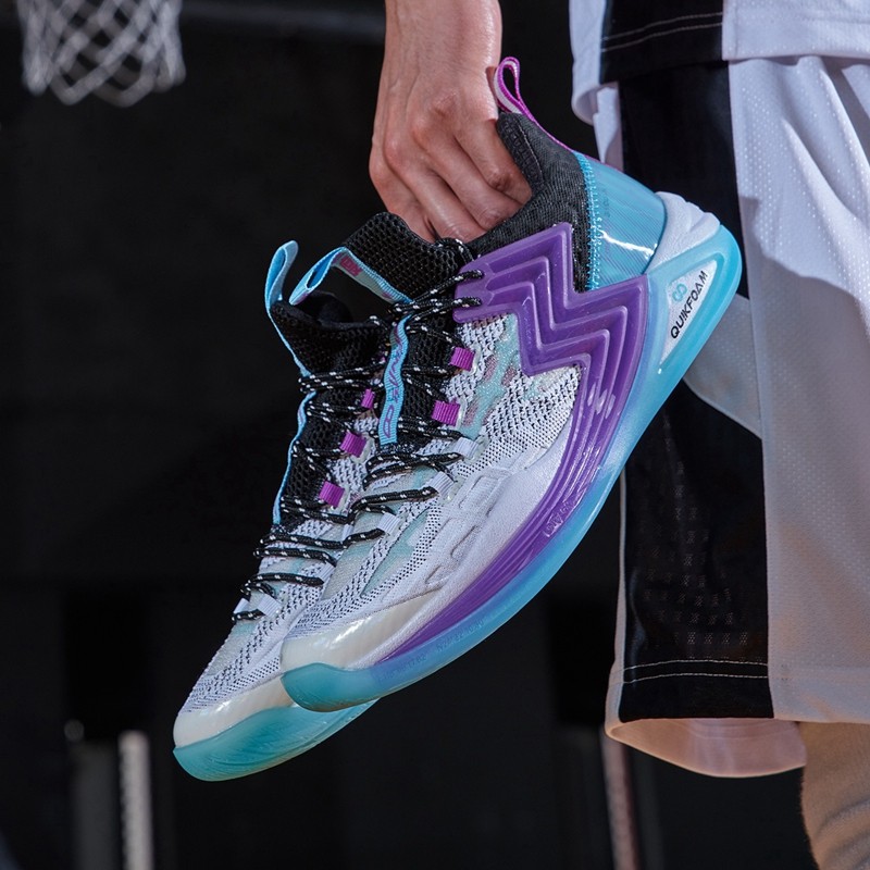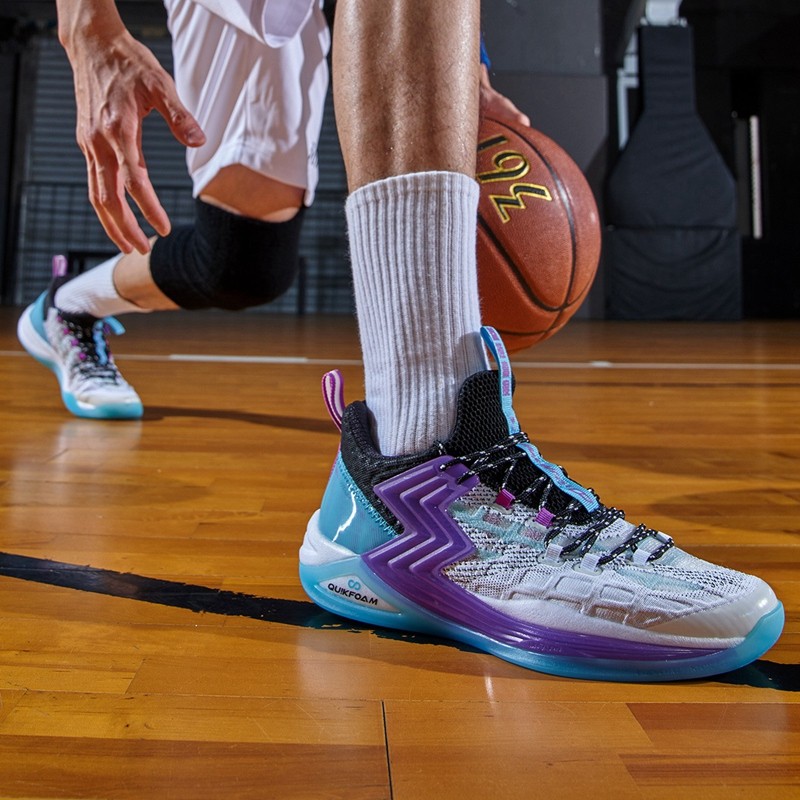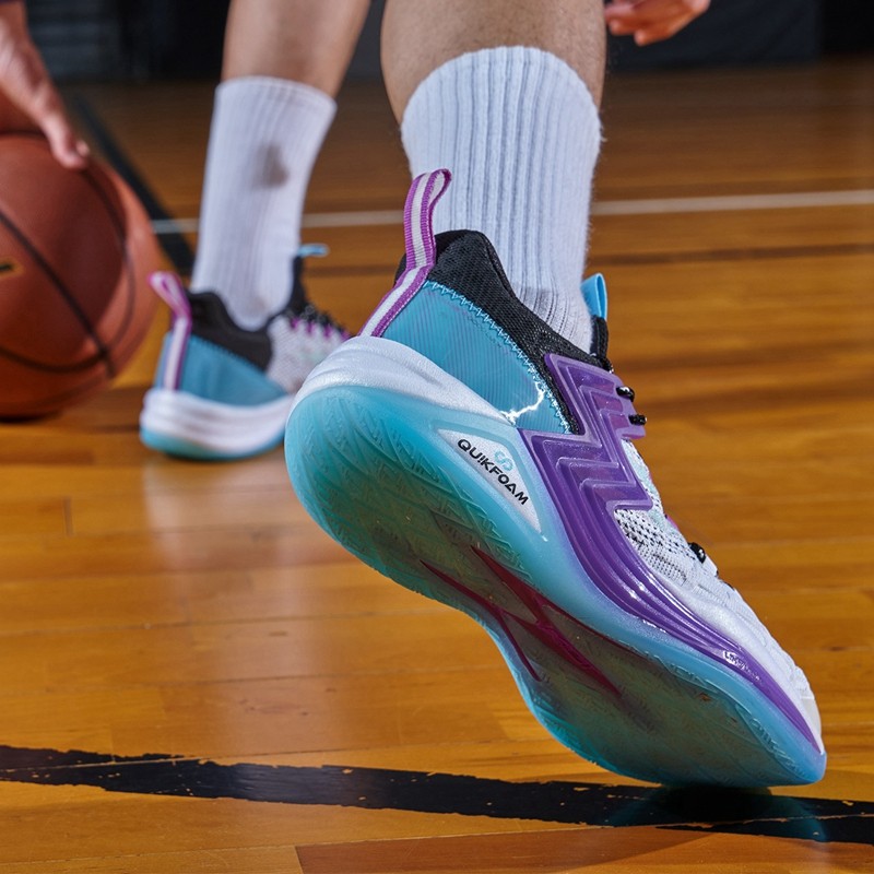 361°Q弹减震防滑篮球鞋阿隆·戈登全明星扣篮大赛战靴,鞋子的邦面采用针织结合tpu网纱包裹性强的同时还具有舒适透气,鞋面笼式结构加强鞋身各方位的支撑与包裹同时兼具轻量化与透气性。TPU全覆盖地面一体搭载渐变“3"logo展现"多一度热爱"的品牌文化同时提供侧向有效支撑,Q弹科技中底具有大力回弹、缓震、耐皱,强力爆发保护关节。鞋底TPU结构源自仿生人体足底筋膜灵感设计有效保护足弓,全掌的橡胶大底防侧翻361°Q弹减震防滑篮球鞋白/奇幻紫配色,鞋面渐变的针织和鞋侧身处采用渐变“3"logo展现,灵感源自于利福尼亚的日落。