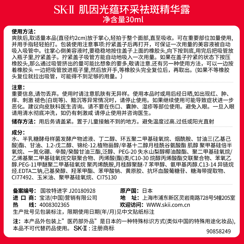SK-II GENOPTICS Spot Essence 肌因光蕴祛斑精华也叫“小银瓶”,是SK-II好用单品之一。16年推出,同期推出还有全新3.0“小灯泡”。这款精华含最新抑制色斑配方Spot Resist Complex,可预防斑点形成,对于斑点预防比淡化既有斑点更重要。同时含有发光海藻萃取Lumina Kelp Extract可抑制黑色素生成,减少皮肤内外色斑。使用方法:先使用SK-II神仙水调理肌质然后沾取适量精华,均匀涂抹全脸,斑点和黯沉部分局部加强,然后进行正常护肤即可。