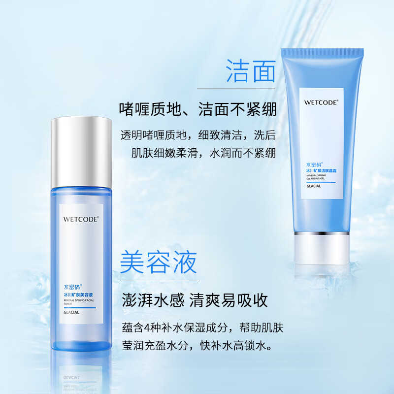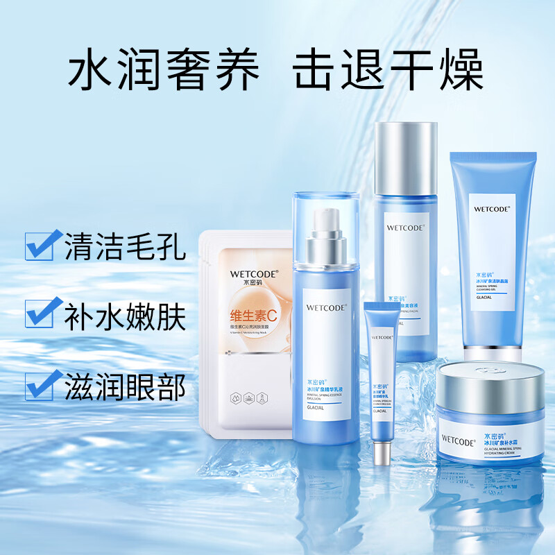 水密码是丹姿集团旗下专业补水护肤品牌;包含海洋源萃、冰川矿泉、雪颜萃、绿茶控油、红石榴新活、透肌水润这六大系列。这组套装就属于冰川矿泉系列,主要包含:洁肤晶露100g+美容液120ml+精华乳液120ml+补水霜50g+眼部精华10g+补水面膜2p+美容液25ml+乳液25ml;含有植物美白的成分,提取雪莲花、茯苓、白蔹根等,可以双重补水,易吸收。