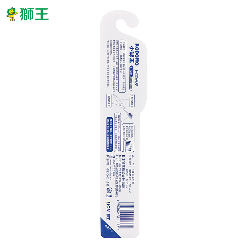 狮王是日本最大的日用消费品公司,也是老牌的日化企业了,旗下的日化洗涤产品,在国内广受好评。此款儿童牙刷适合3-6岁儿童,根据宝宝生长特点采用的0.01mm的进口超软细毛,非常适合清洁牙缝中的污垢,呵护宝宝稚嫩的牙龈;刷头约19mm,小巧圆润,适合幼童嘴型,避免使用过程磕碰不适。双重适齿段差植毛设计,有效清洁牙齿及齿缝。刷柄处印有卡通形象,深受宝宝喜爱。