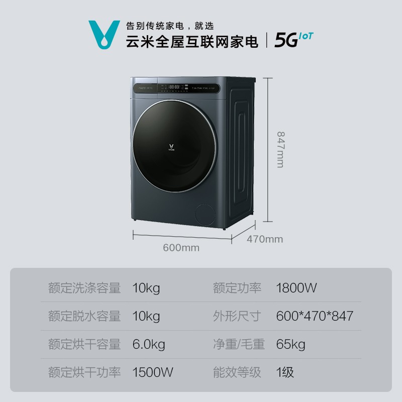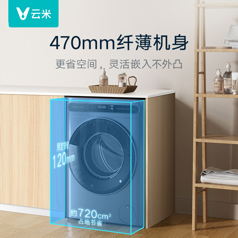 云米 WD10FE-B6A 洗烘一体机,纤薄机身,节省空间,更易嵌入,采用激光无缝焊接内筒,护衣不伤衣,具有除菌洗模式,有效去污除菌,呵护家人健康,搭载清洗空气洗,可去除衣物异味,智能烘干,衣干即停,避免过热引起衣物变形缩水、起皱,不伤衣物纤维。90°高温筒自洁,全屋互联。产品尺寸600*470*847mm,额定功率1800W,额定容量10KG,一级能效,IPX4防水等级。