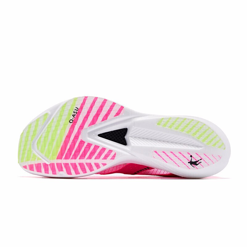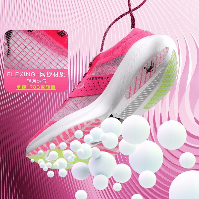 飞影的鞋面大面积采用了“薄如蝉翼”的网纱材质,仅在鞋带、鞋跟、五趾等特殊部位进行了加厚防护,而这种近乎透明的网纱鞋面设计除了大大减轻了产品整体的重量,更是加速了鞋内外空气的流通,让跑者穿着更舒适、更干燥,尤其是在夏天的桑拿天,这方面的特性体现的最为明显。飞影的中底采用了巭PRO回弹科技,这是乔丹2020年主推的核心材料科技,理所当然的被应用在了全新的碳板跑鞋上面,全新的超临界物理发泡工艺,不仅仅是排布更加均匀致密,同时能够拥有更强的减震性、回弹力以及更多的能量反馈。当然不要忘了,飞影是一双碳板跑鞋,它里面内置了一块高韧性勺型全掌碳纤维板,利用它的韧性给跑者在运动中提供强大的形变恢复能力,同时加大回弹力,减少运动中的能量消耗,从而帮助跑者提高运动成绩。