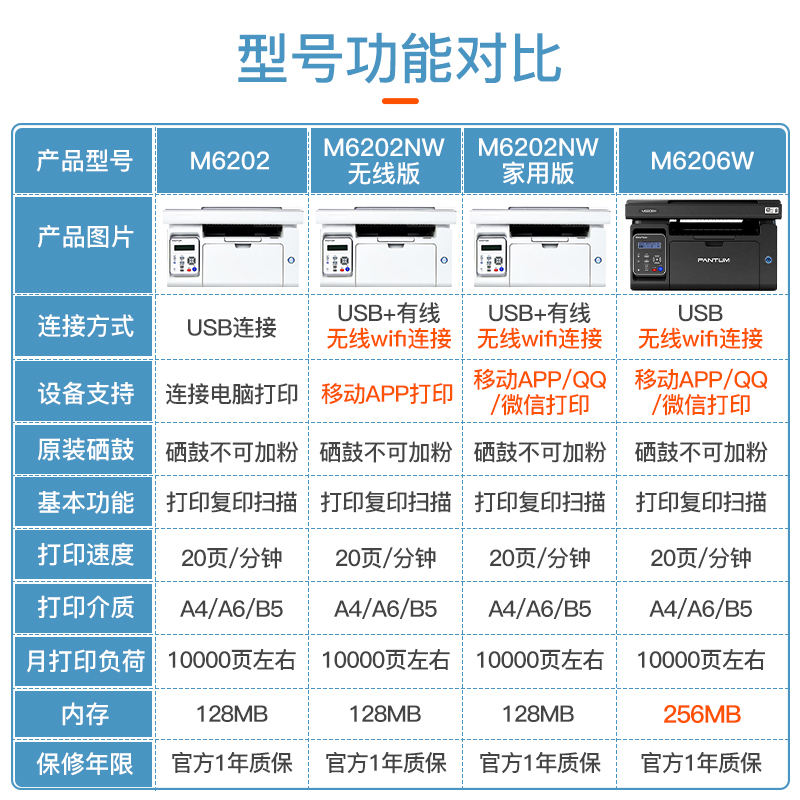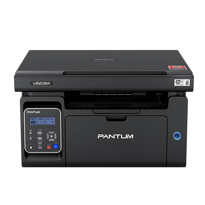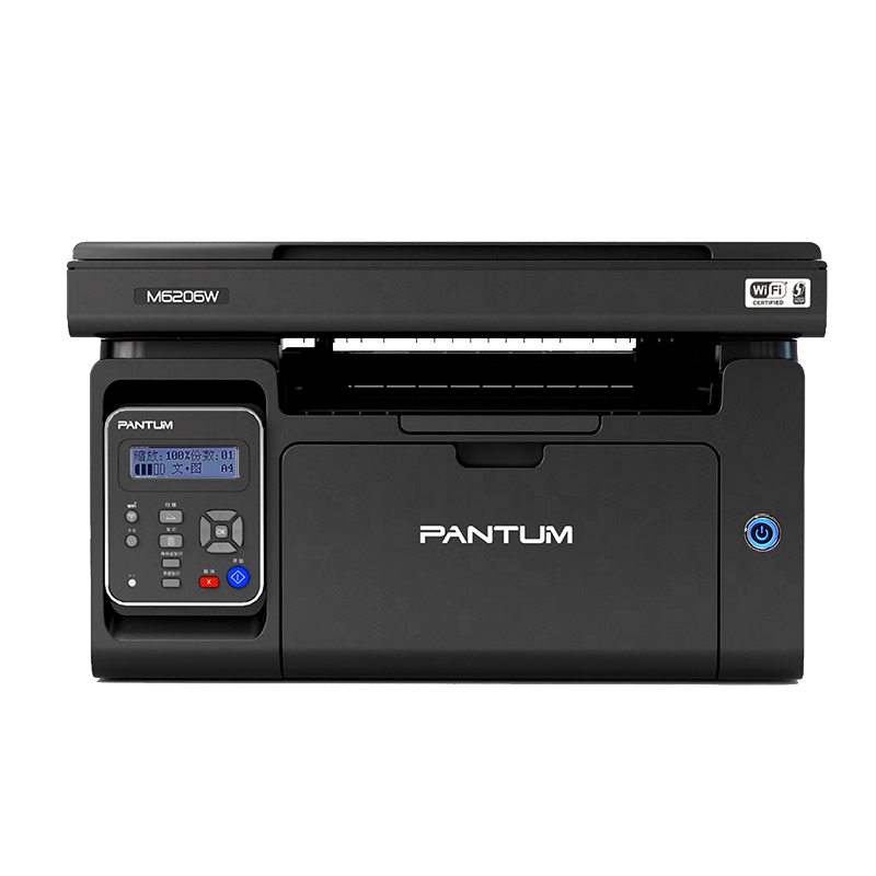 PANTUM 奔图 M6206W 黑白激光多功能一体机,这款打印机外观颜色为黑色,打印机类型为黑白激光一体机,幅面为A4,打印速度为20页/分钟。不支持自动双面打印,一体式硒鼓设计,支持无线连接,打印分辨率为最大 1200×1200dpi。参数方面,外观尺寸为417x305x244mm,产品净重7.50kg。