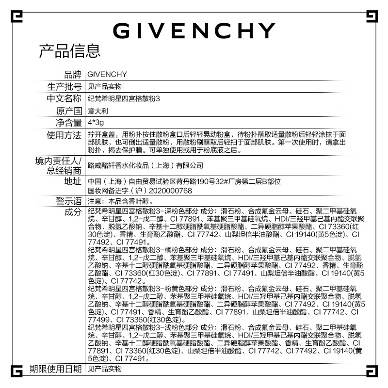 这款散粉属于纪梵希的明星产品,每款带有4种不同的配色,使用的时候轻摇,四个色号分别为1、轻柔淡彩系列,白色、蓝色、绿色、紫色搭配,可以提亮肤色;2、精致米色系列,适合自然肤色;3、柔和白色系列,浅米色为主,比较自然;4、焦糖玫瑰色系列,中性玫瑰色调,适合打造健康亮泽妆容。