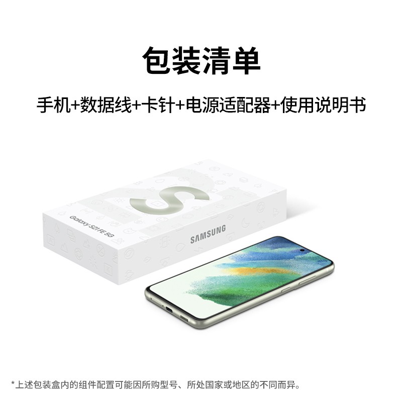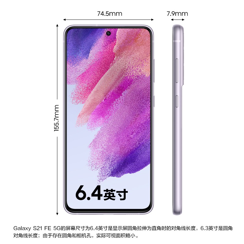 三星 SAMSUNG Galaxy S21 FE 5G手机,整体机身155.7×74.5×7.9毫米,重量为390g,相比上一代更小更薄,背面设计极简,相机模组垂直排列,背面由优质的塑料制成,覆盖有康宁大猩猩玻璃Victus。极致简约的外观,让整个手机非常有质感。