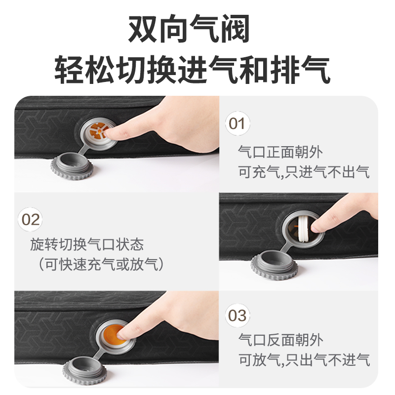 气阀里设计360°旋转气嘴芯,轻松切换进气和排气。充气后,可用嘴吹几口,气垫会变得结实硬挺。