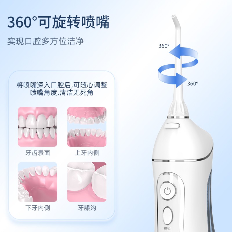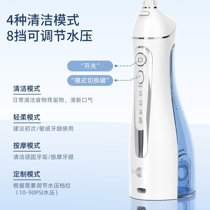 这款博皓的5025冲牙器,采用无线式设计,喷嘴可360°旋转。金属泵配合低压直流电路,长时间使用不升温。 四档冲洗模式、自定义模式8档水压可调,1400次/分钟高频率脉冲水柱,储水量200ml,全身水洗,IPX7防水等级,USB充电, 1400mah锂电池,两分钟定时关机,防止误按。可以有效清洗牙缝间及牙床难刷部位的细菌,按摩牙肉及有效预防牙龈炎, 饭后使用冲牙器一分钟可及时将牙缝里的食物残渣、软垢清除干净,减少剔牙和口腔异味。