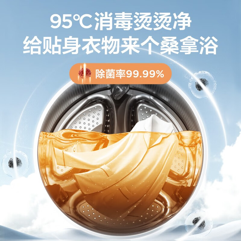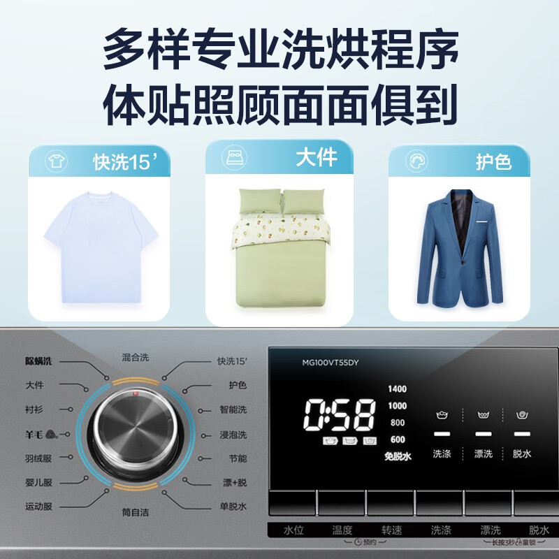 美的MG100VT55DY滚筒洗衣机采用BLDC变频电机,最高转速可达1400r/min,洗涤脱水效率更高,同时静音稳定,洗净比1.05。水流聚合技术,通过内桶的1062个孔眼,聚成一个高压水中心,形成水柱强劲喷射。双重蒸汽抗菌除螨,有效杀灭螨虫、细菌和病毒,配合抗菌门封圈,营造无菌洗衣环境。洗衣机深(含门)宽高为600*595*850mm