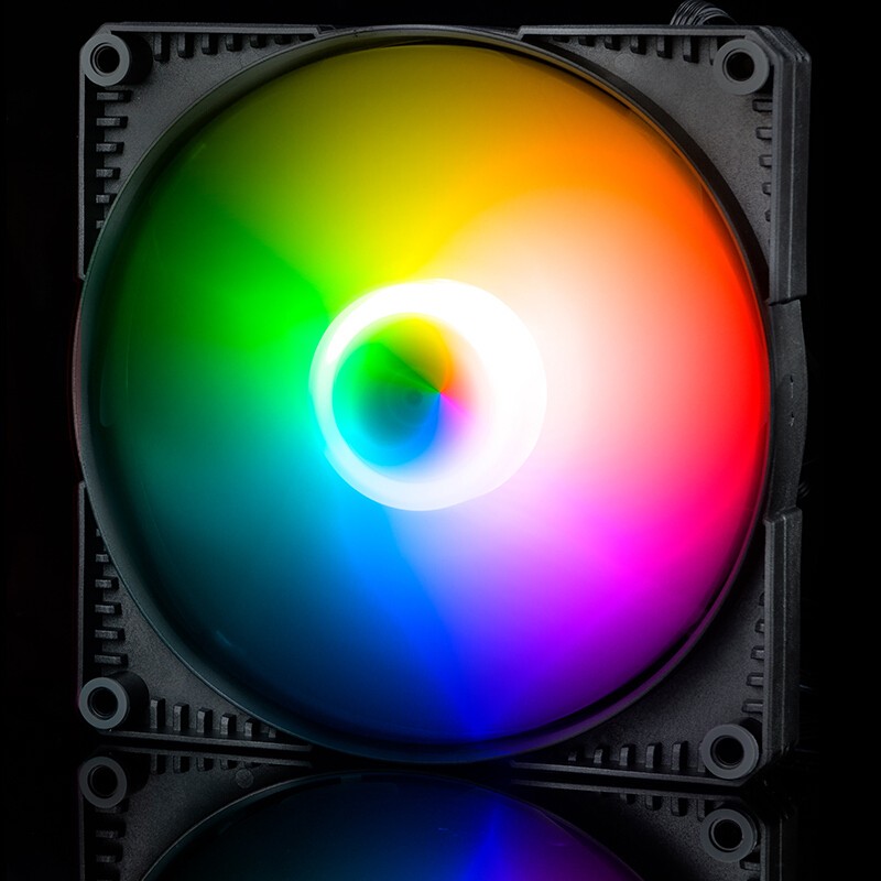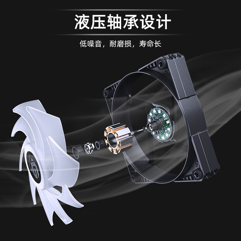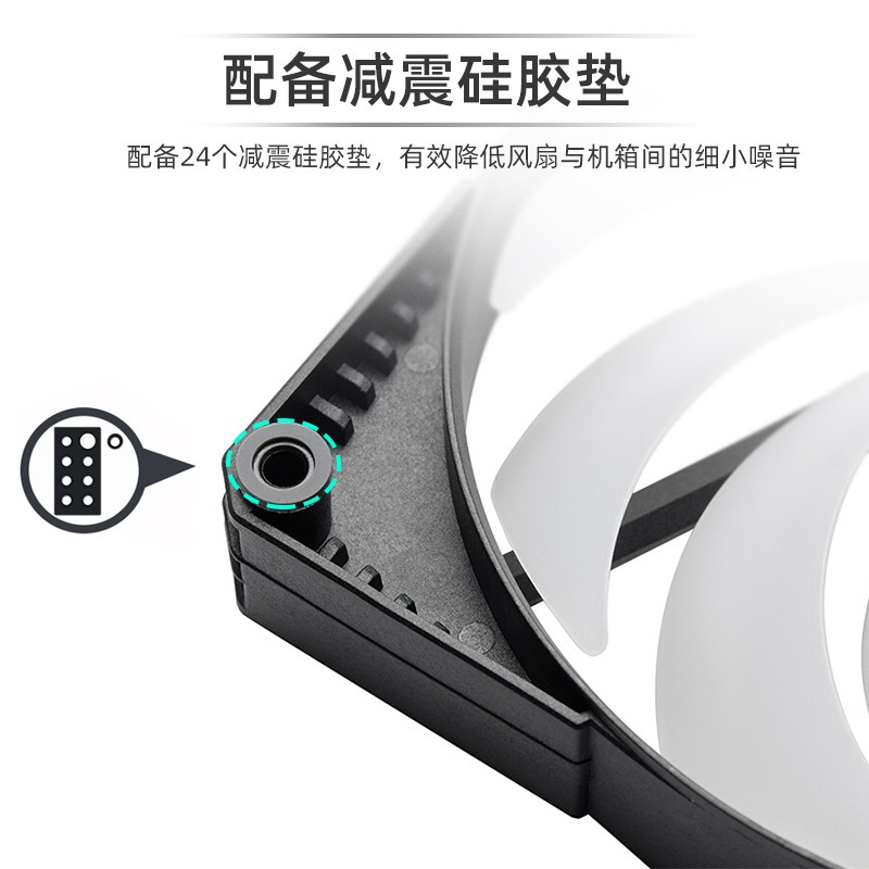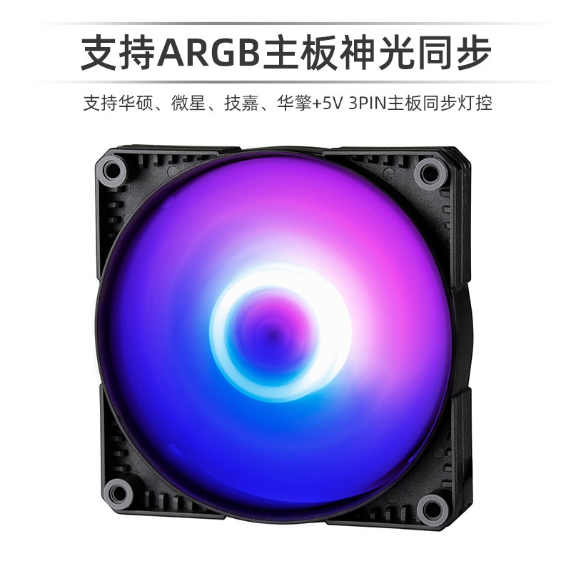 温控幻彩风扇,12颗灯珠,灯光均匀柔和,支持ARGB主板神光同步。配减震硅胶垫,静音不共振,扇叶逆时转,大风量高风压设计,扇叶切边,静音降噪。液压轴承设计,4PIN接口直接接主板,支持PWM(温控脉冲自动调速)