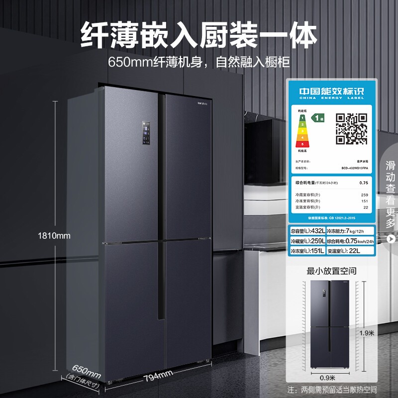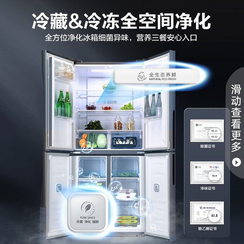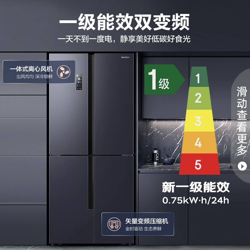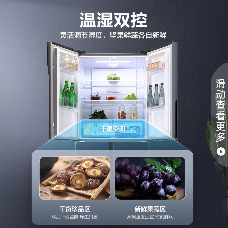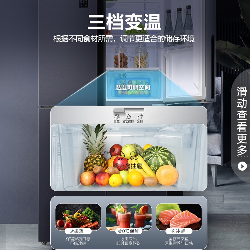 灵活调湿营养满分 精致轻食唤醒身体活力,干湿调节空间,根据食材储存需求匹配专属呵护 坚果、鲜蔬保留自然口感和营养,健身养生从精储开始。三档变温 健康鲜食随需而变,果蔬、0℃保鲜、冰鲜模式三档调节 科学存储给予食材专属呵护,各式美味鲜如初生。搭载一体式离心风机和变频压缩机 运行稳定温度波动小,食材均匀受冷持久锁鲜。纤薄机身可完全藏身于橱柜,精巧不占地 90度直角开门,摆脱空间束缚,小家也要处处敞亮。
