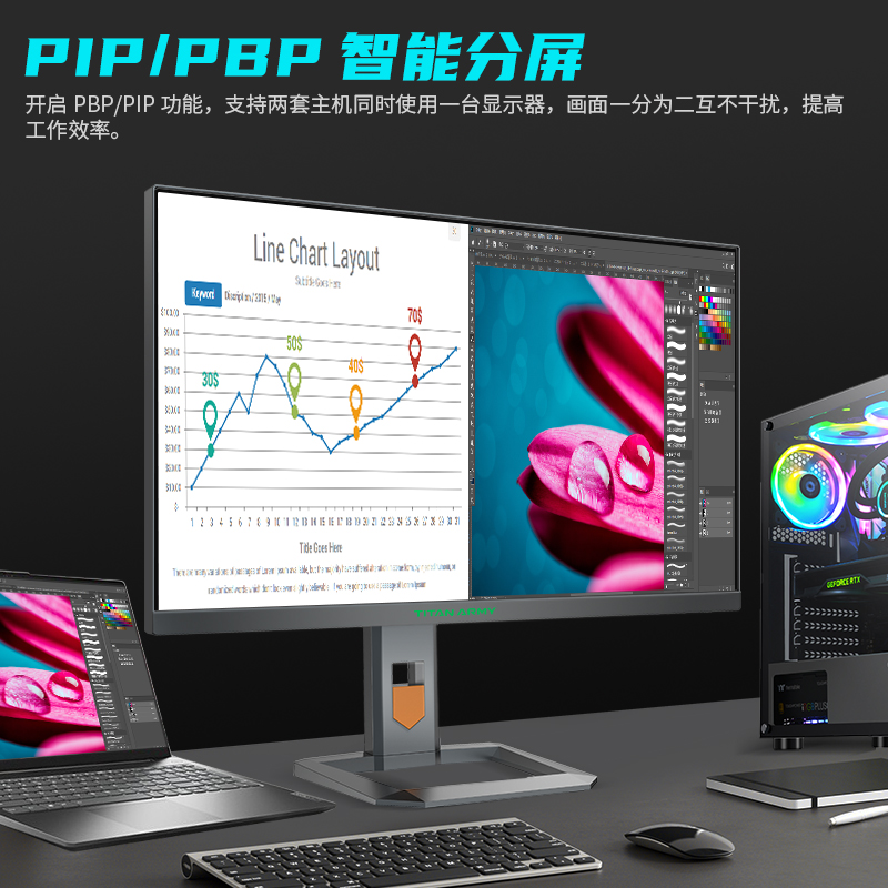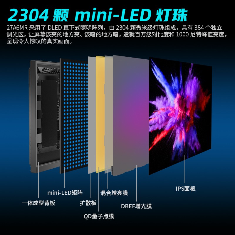 这款显示器采用Mini-LED背光,具有384个局部调光区,支持HDR1000,具有超高画面动态范围。 友达M270DAN08.2 FAST IPS液晶面板,27英寸、分辨率2560×1440、刷新率165Hz、1ms(GTG)响应、覆盖99%DCI-P3色域。 支持Adaptive-Sync画面垂直同步技术,支持PIP/PBP分屏,支持Game Plus游戏模式,支持低蓝光护眼模式,支持自动亮度调节,搭载RGB电竞背光灯。 支持升降、俯仰、水平旋转、横竖屏调整,支持VESA 100×100mm壁挂安装(需要壁挂转接件)。配有2×HDMI2.0+DP1.4+3.5mm Audio Out接口。