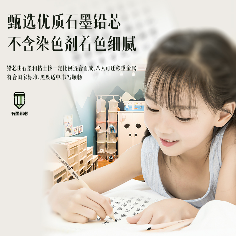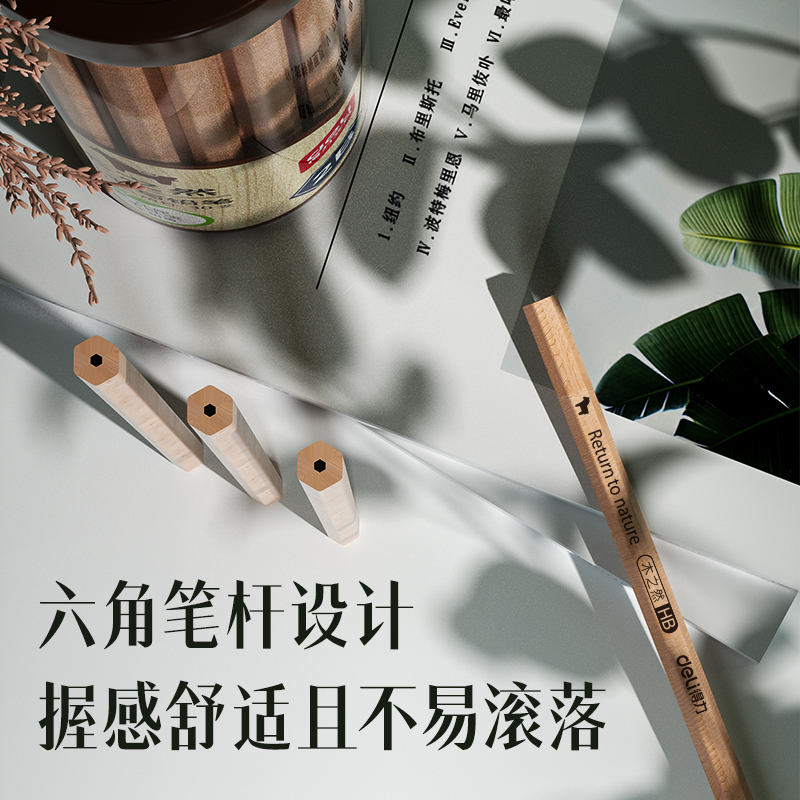 deli 得力 木世界系列 S908 铅笔,采用原木材质,软硬适中,木材经过软化处理,削声清脆,削笔省力,六角笔杆,兼顾美感和舒适,石墨笔芯,选用含碳量高,颗粒细的石墨支撑铅芯,使其书写顺畅细腻笔触不易折断。