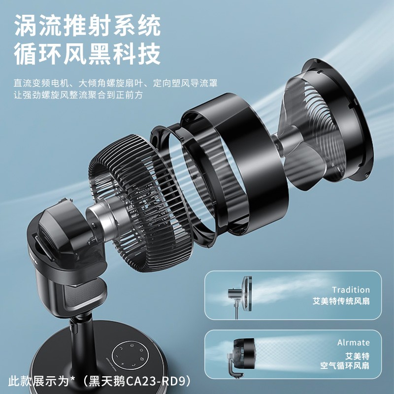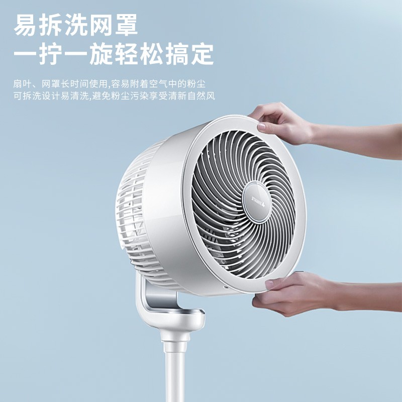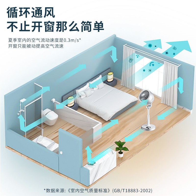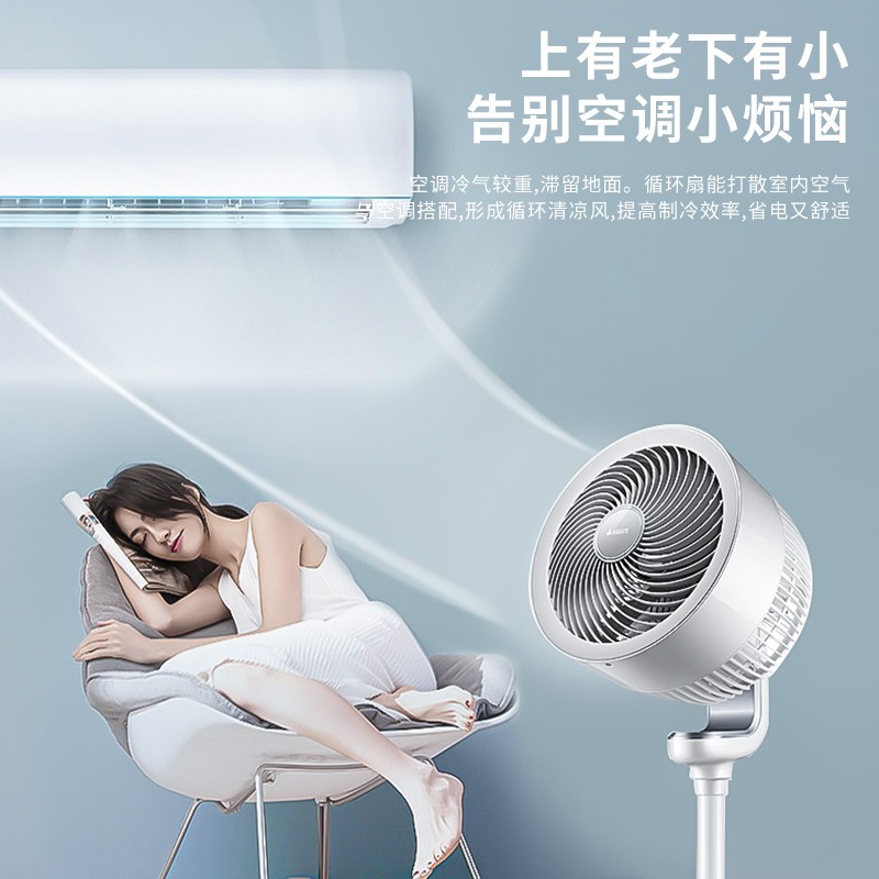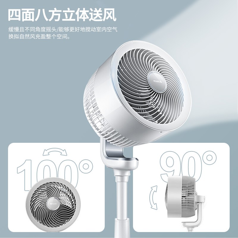直流变频电机、大倾角螺旋扇叶、定向塑风导流罩 让强劲螺旋风整流聚合到正前方 风距更远更集中,加速封闭的空间空气循环流通。左右约100度、上下约90度立体自动摆头,缓慢且不同角度摇头 能够更好地搅动室内空气,换拟自然风充盈整个空间。空调冷气较重,滞留地面。循环扇能打散室内空气 与空调搭配,形成循环清凉风,提高制冷效率,省电又舒适。