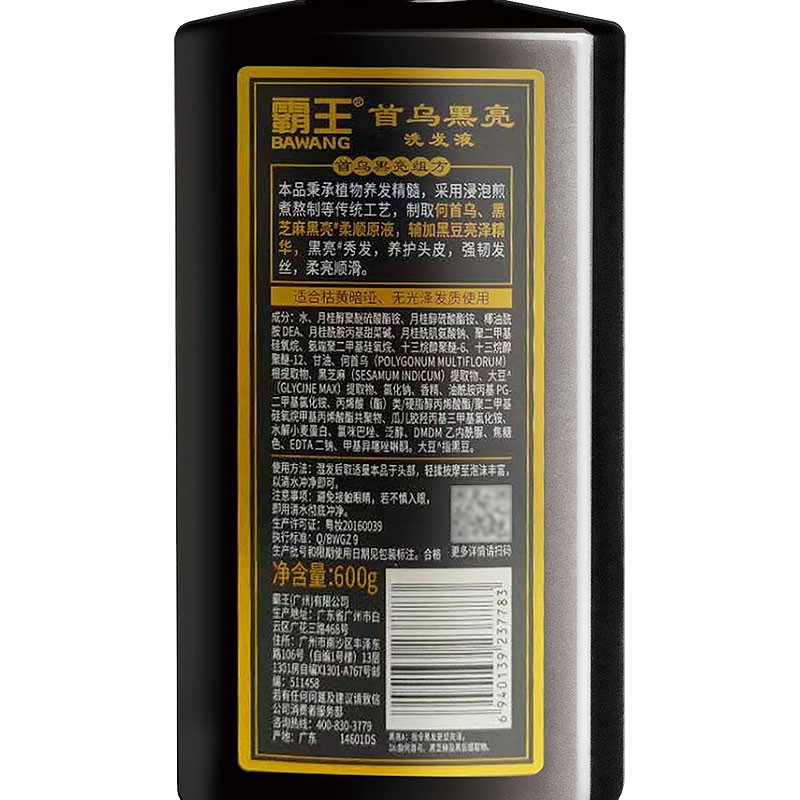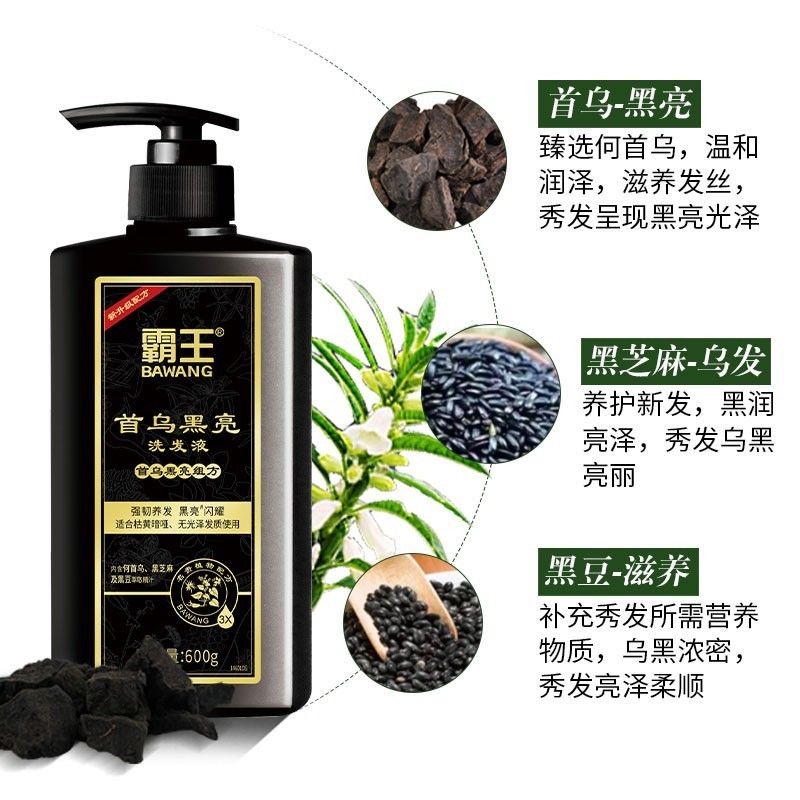 霸王(BAWANG)推出的这款洗发液,内含首乌提取物、黑芝麻提取物、黑豆提取物等成分,帮助清洁头皮多余油脂的同时,修护受损伤发质,为秀发补充所需营养物质,调理和滋润头皮,强化发根,令头发乌黑浓密、顺滑亮泽。适用于枯黄、暗哑发质。