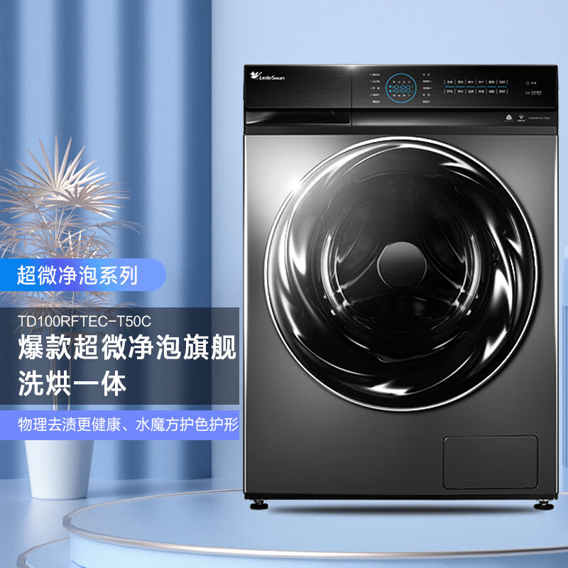 小天鹅洗衣机物理去渍更健康,超微净泡洗,水魔方冷水洗,3D立方内筒,纳米银离子除菌,快舒省蒸汽烘干,超跑外观设计,专利超微净泡引擎产生亿万小汽泡,深入衣物纤维,物理去渍无残留,超微净泡引擎,通过亿万小汽泡深层清洁油污,无需洗涤剂即可去除油污,冷水洗涤不加热,通过变幻三大水流强力洗浄衣物,深层瓦解污渍,更有效保护衣服不变形不褪色,立体凹凸造型,模拟搓衣板洗衣过程,搭配魔力提升筋,增加摔打力度,有效剥离污垢,纳米银离子除菌,净衣抑菌更健康,10kg大容量全家衣物一次搞定。