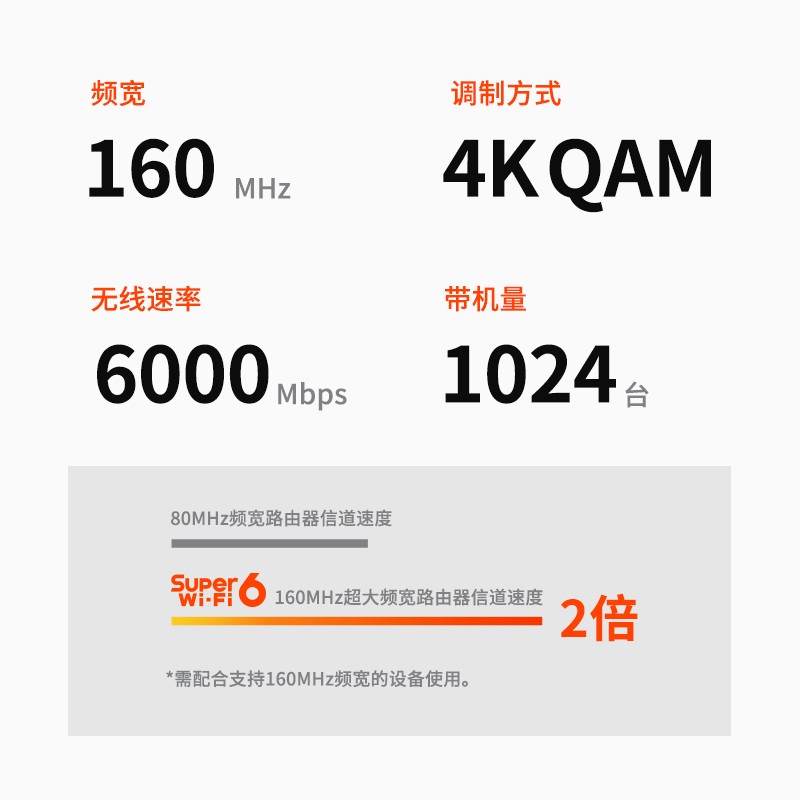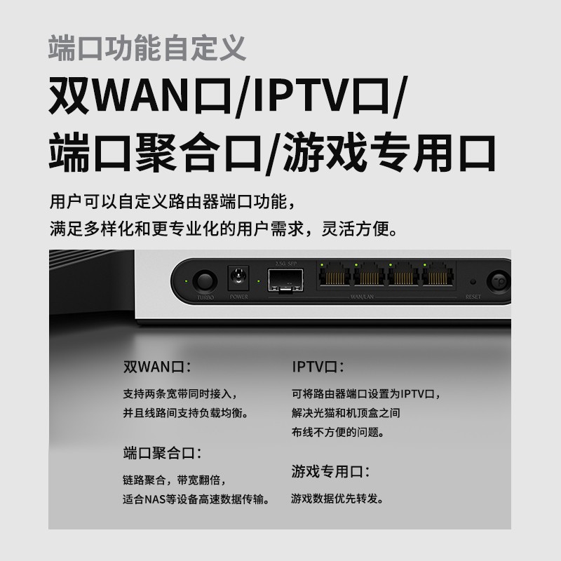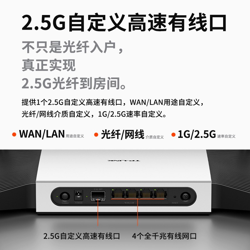 普联 XDR6080易展Turbo版 AX6000双频全千兆无线路由器,支持160Mhz频宽、4K QAM调制方式,双频8流,无线速率高达6000Mbps,带机量高达1024台。提供1个2.5G自定义高速有线口,WAN/LAN用途自定义,光纤/网线介质自定义,1G/2.5G速率自定义。端口次啊用SFP插槽形式,比固化口的用途更加广泛灵活。搭配TP-LINK丰富的高性价比SFP光/电模块资源,用户可根据自身需求,随时添加、灵活使用。