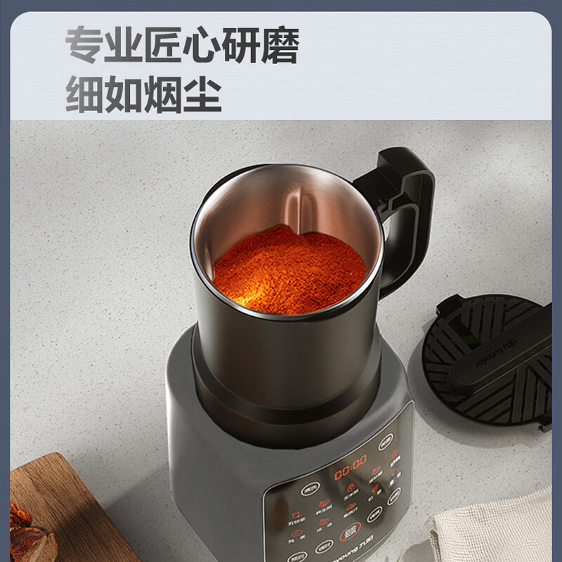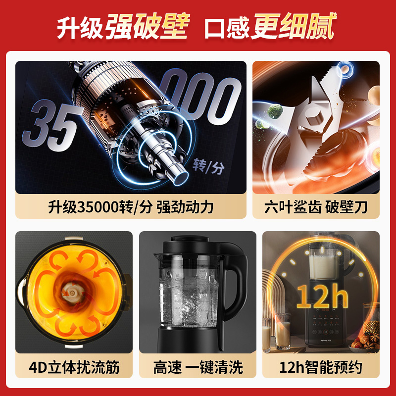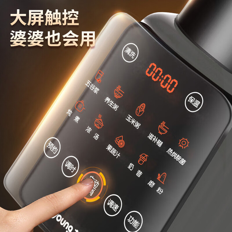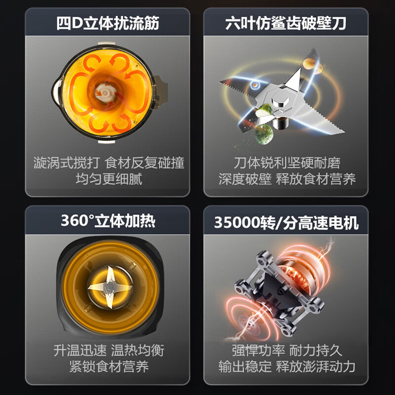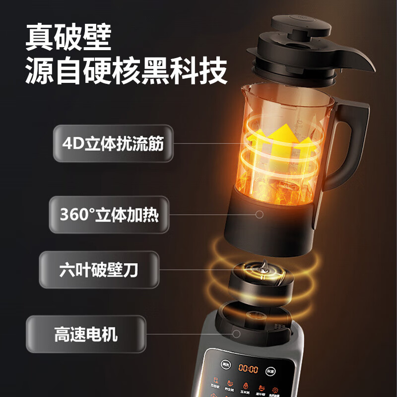 破壁料理机研磨功率为800W,转速高达35000转/分钟,加热功率为800W,搭配钝刀刀头,使得研磨更加精细,官方宣称可达到破壁免滤效果,支持调温功能,可对食材进行独立加热,倒梯形杯体,加热均匀不易糊底,内置防溢电机,防止扑锅,温度、转速、时间均可独立调节,轻声运行不闹腾,搭载恒速降噪电机主动降噪与三重被动降噪技术,层层削减噪声力求更静破壁,十分方便。顶置触控大屏,清晰显示,功能一目了然,营养饮品指尖掌控。